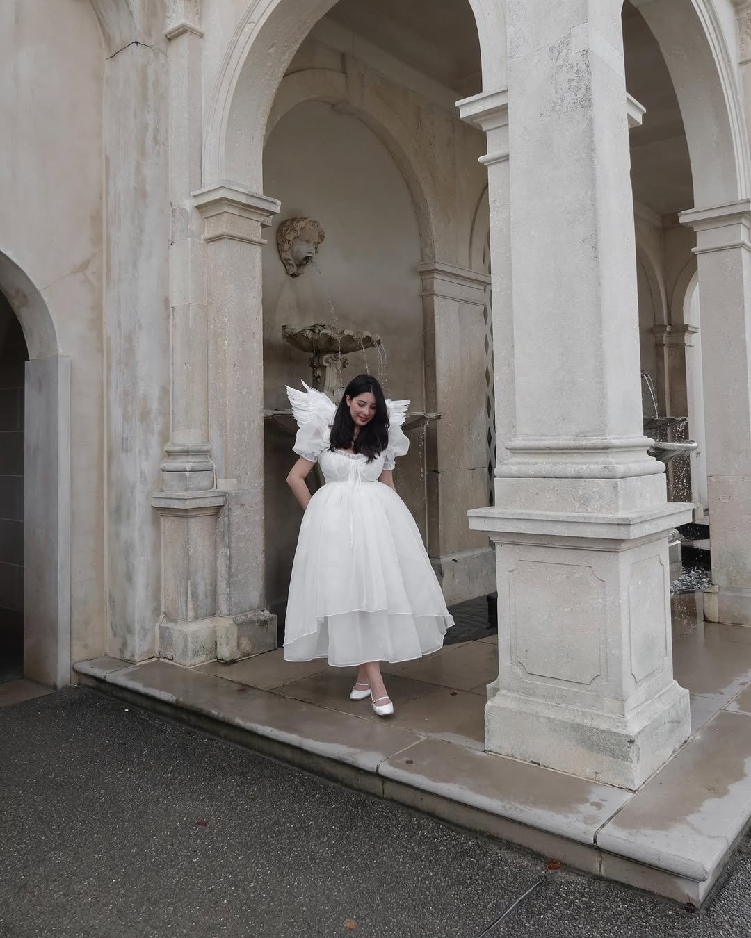 There’s something almost magical about this white dress. The puffed sleeves and flowing skirt create a silhouette that feels light and ethereal, especially against the grand architectural backdrop.