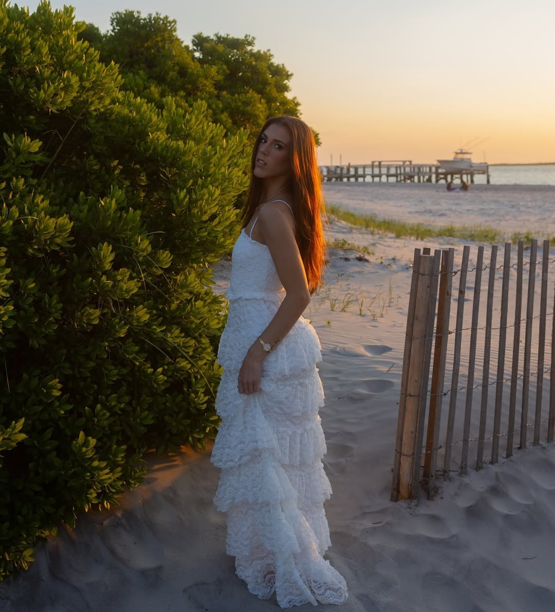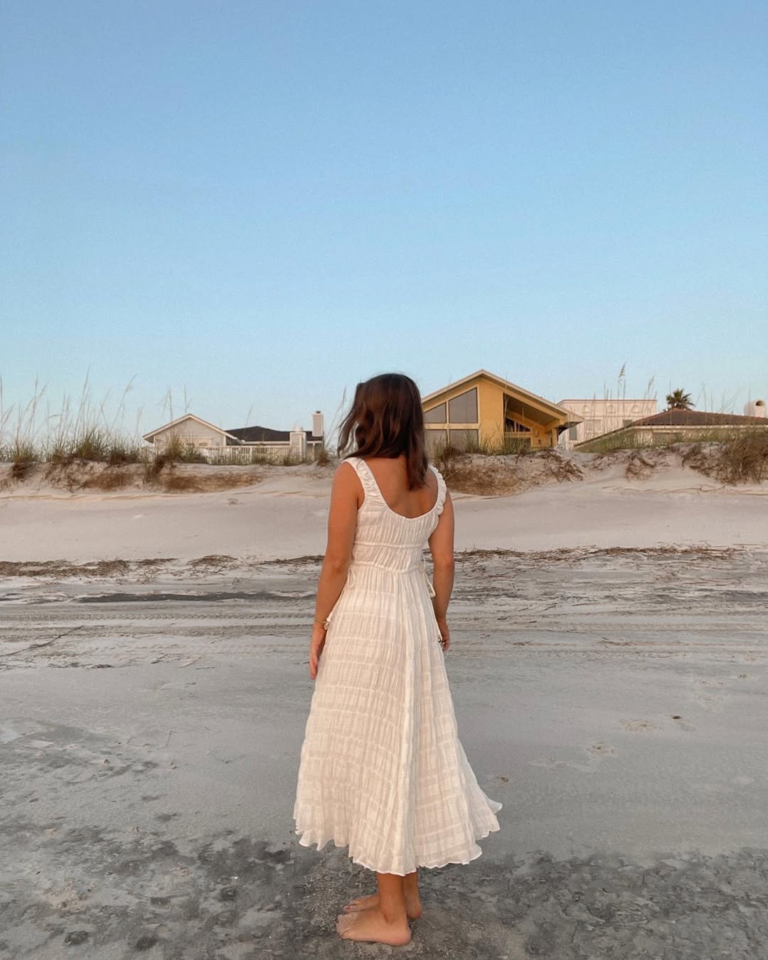 A sunset beach walk already feels cinematic, but a textured white dress like this makes it even better. The soft layers catch the warm light, creating that glowing golden hour look everyone hopes for in vacation photos.