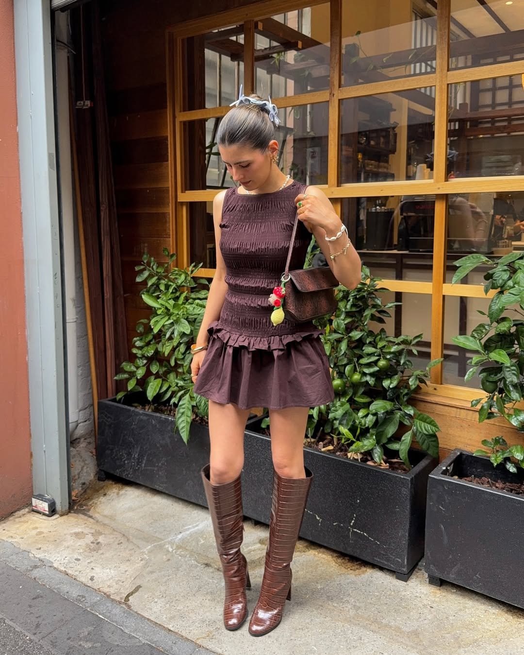 There’s something about rich chocolate tones that instantly feels polished. This ruched mini paired with tall leather boots has that cool city energy, the kind of outfit you’d wear for a late afternoon coffee that somehow turns into dinner plans.