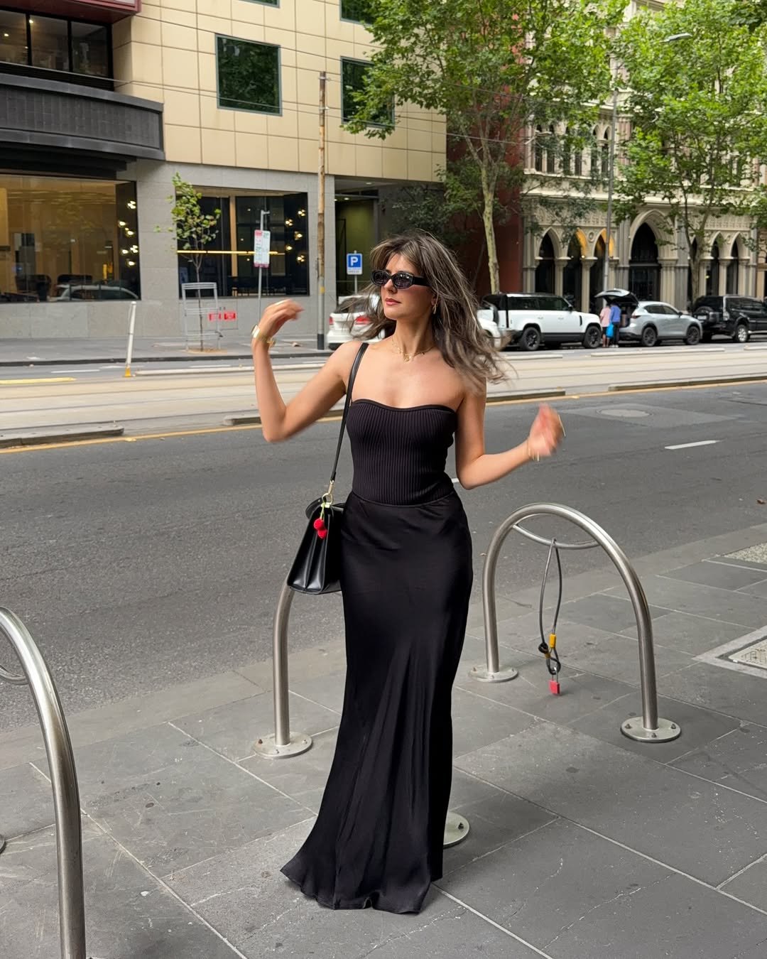 There’s something timeless about a sleek black dress in the middle of a busy city street. The strapless bodice and fluid skirt create a silhouette that feels elegant without trying too hard.