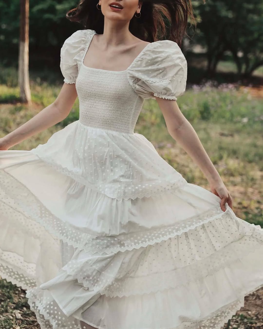 Some dresses just capture timeless romance, and this flowing white prairie dress does exactly that. With its soft tiers, subtle texture, and puff sleeves, it carries that vintage-inspired charm that never feels outdated.