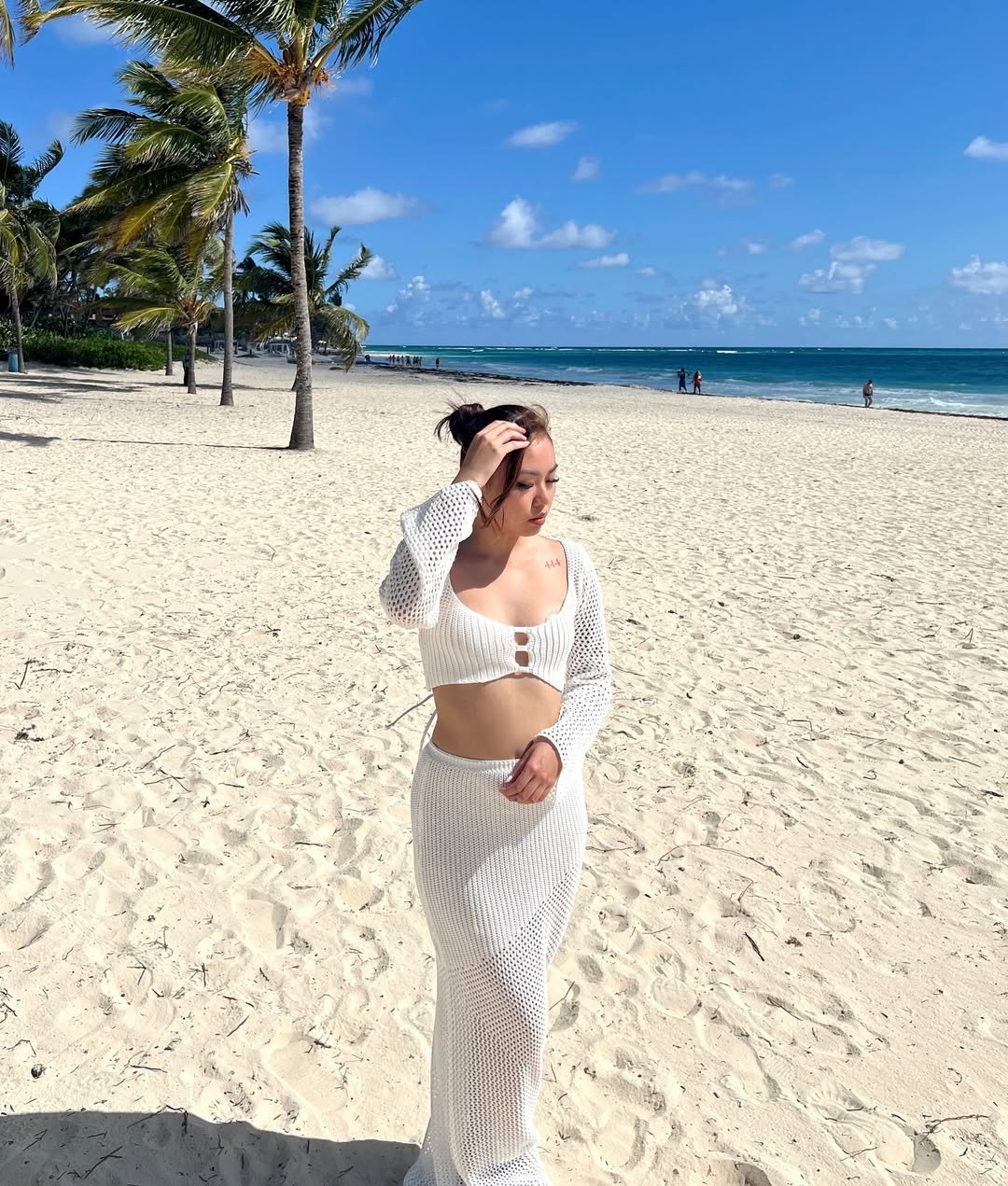 A soft knit set on a sunlit beach just feels right. The delicate crochet texture and creamy neutral tone make this outfit look effortless, like something you’d throw on after a swim and somehow still look incredibly styled.