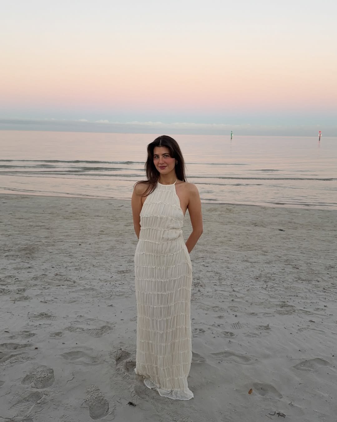 The textured fabric adds subtle detail while the halter neckline keeps the silhouette graceful. It’s the kind of dress that feels made for sunset walks, ocean breezes, and those quiet summer nights that stretch on forever.