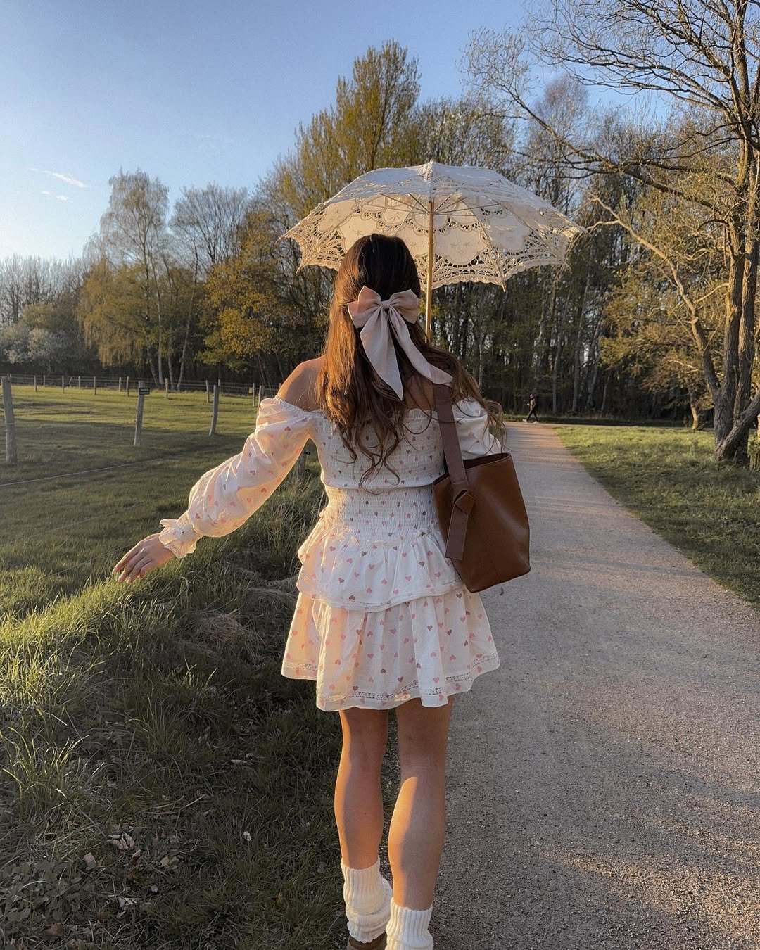 Add the lace parasol and ribbon bow, and suddenly the whole scene feels romantic and nostalgic. It’s the kind of outfit that turns a simple walk down a quiet path into a slow, dreamy moment.
