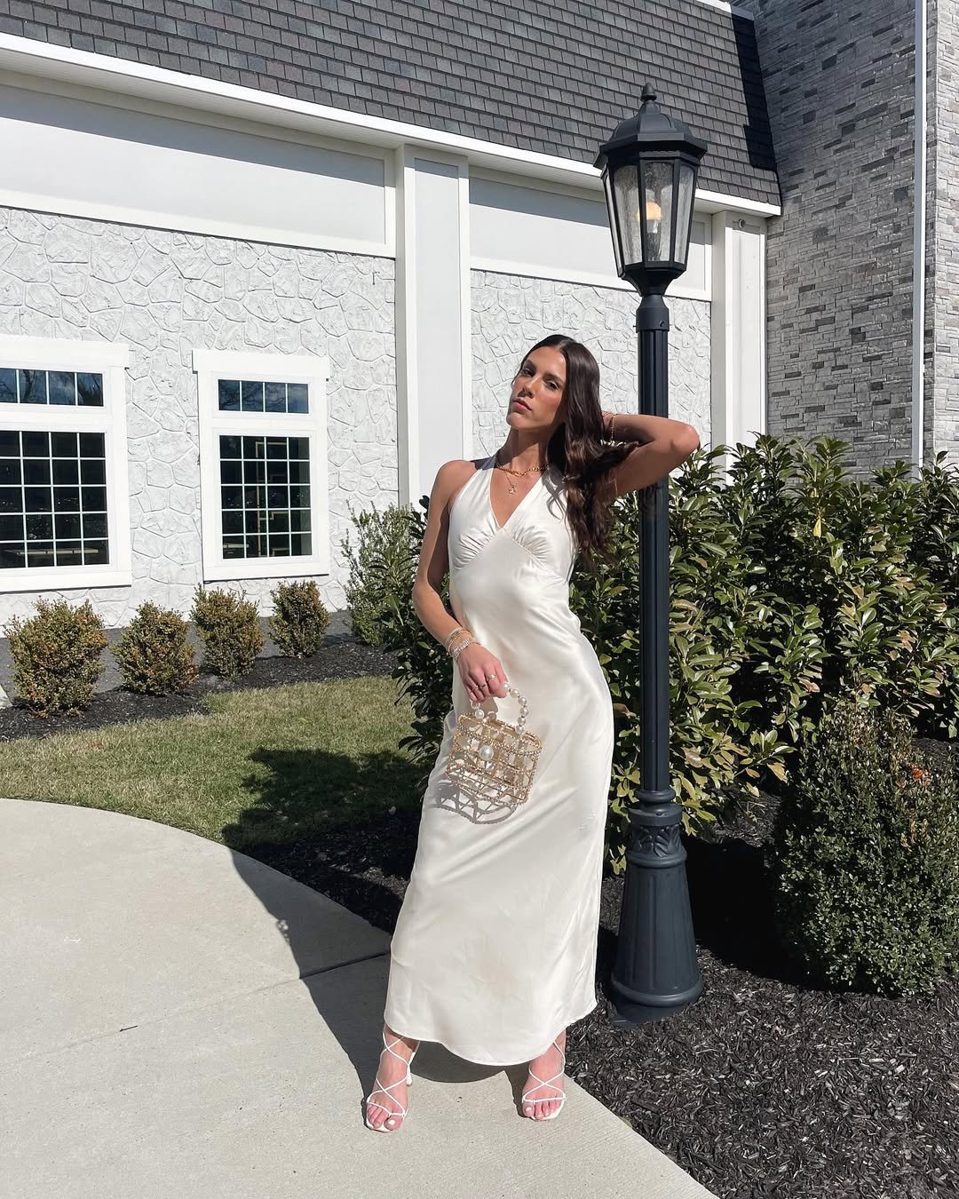 This look has that quiet luxury energy that always feels effortless. A sleek cream slip dress, delicate straps, and barely-there heels create a silhouette that feels soft yet striking under bright afternoon light.