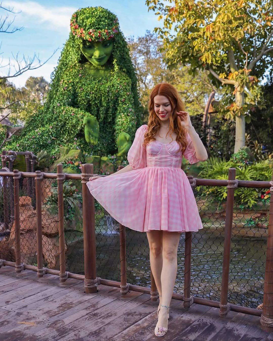 Some dresses feel straight out of a storybook, and this soft pink gingham piece is definitely one of them. Between the romantic bodice and floaty skirt, the whole outfit carries a dreamy, almost whimsical charm.
