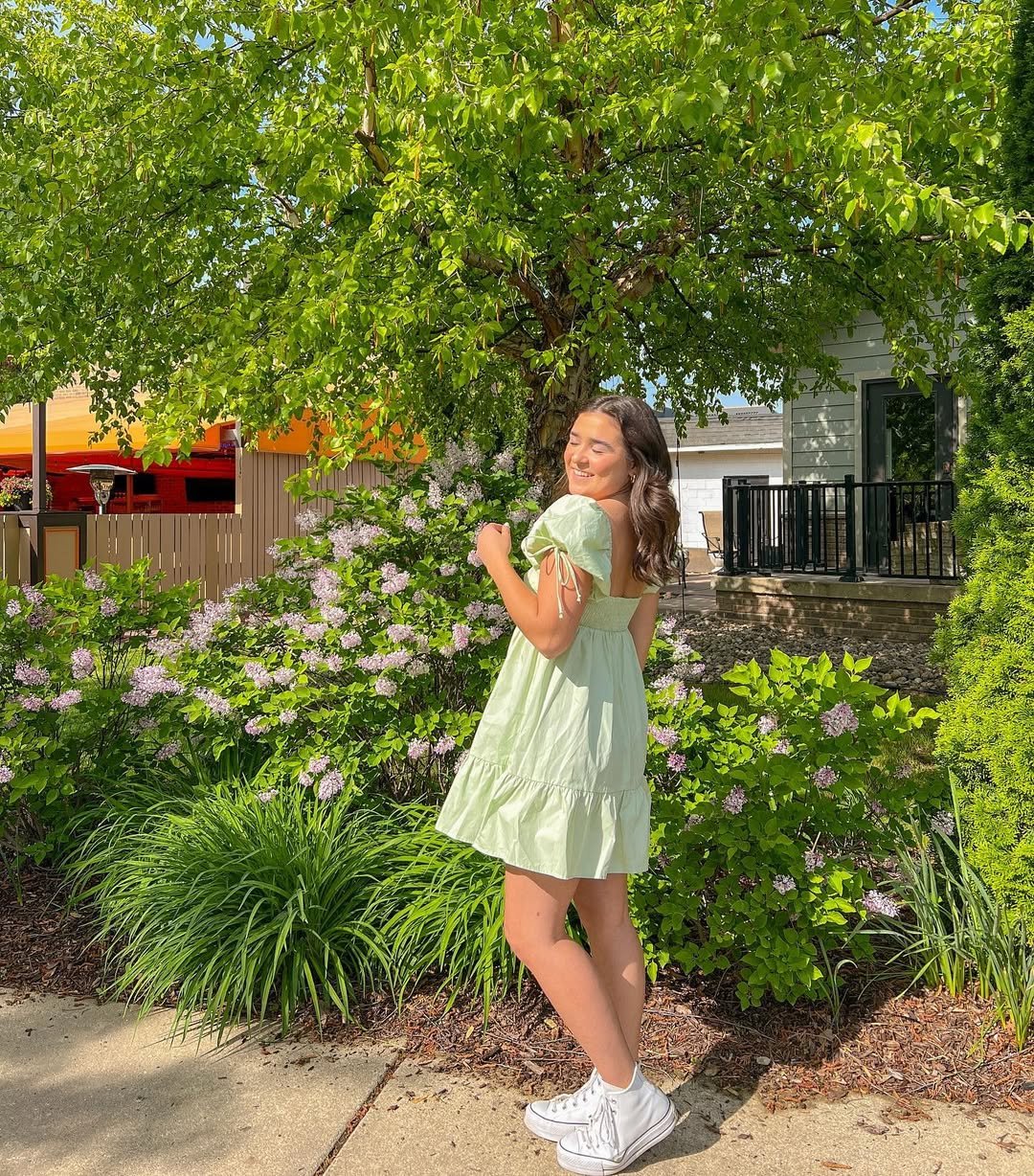 The puff sleeves and soft gathered skirt bring that gentle cottagecore charm. Styled with classic white sneakers, it stays playful and easygoing, proving that pretty dresses don’t always need heels to feel complete.