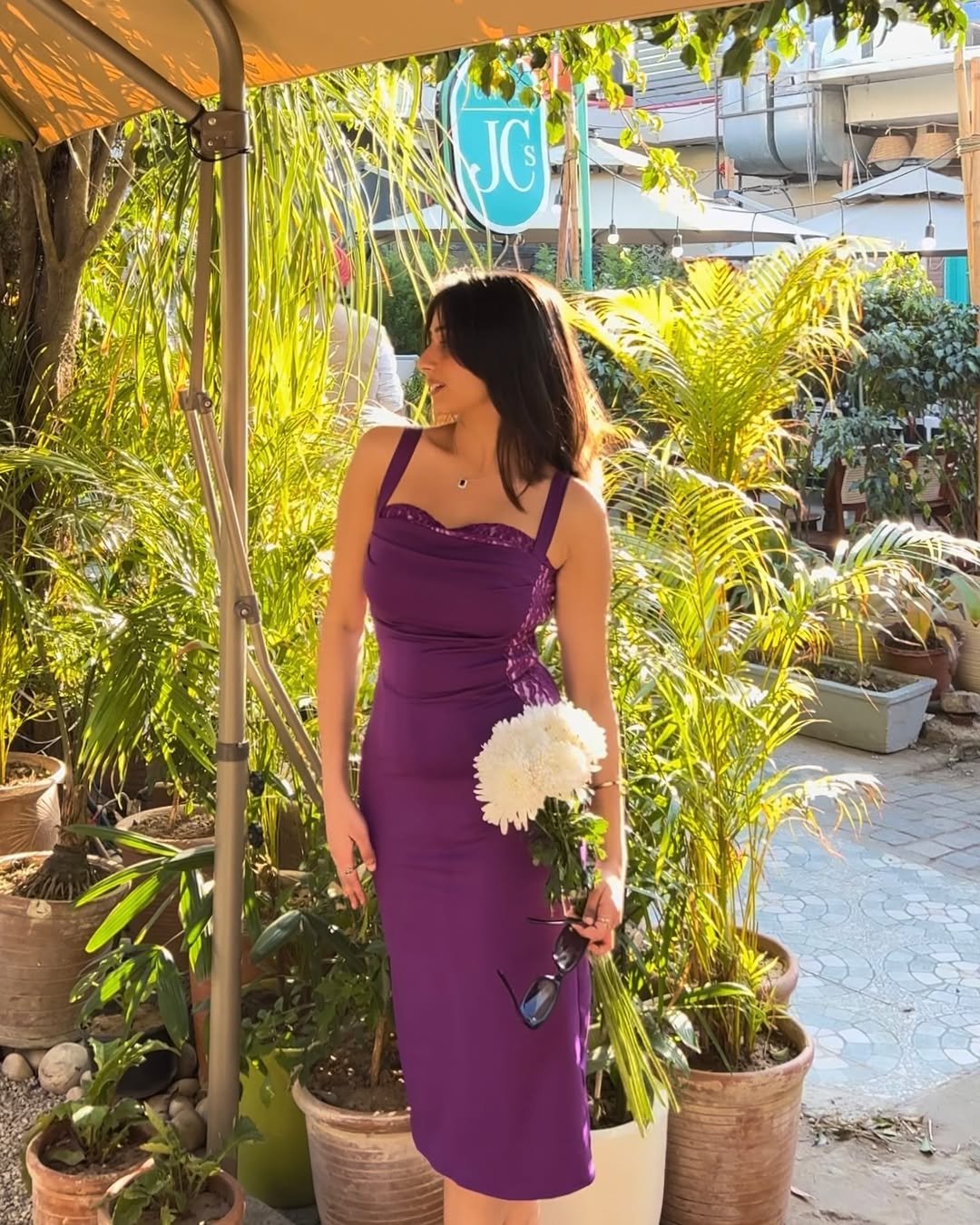 A deep lavender dress has that subtle elegance that works for so many occasions. The fitted shape and delicate lace detailing give it a romantic touch without feeling overly formal.