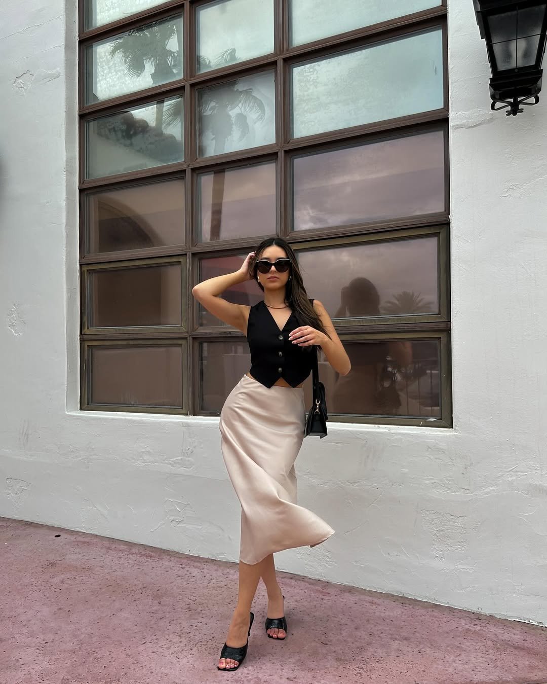 Sometimes the most aesthetic outfits are the simplest. A black structured vest paired with a silky neutral skirt creates a look that feels modern, polished, and incredibly wearable.