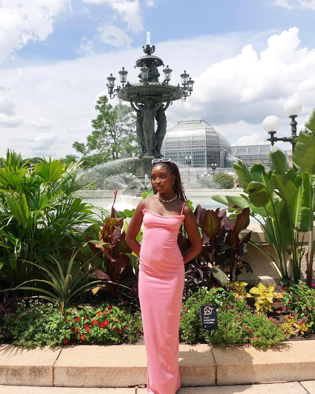 A sleek pink column dress always delivers a graceful moment. Standing beside a grand fountain, this look feels almost cinematic, like something you’d wear to an outdoor museum date or a summer evening event.