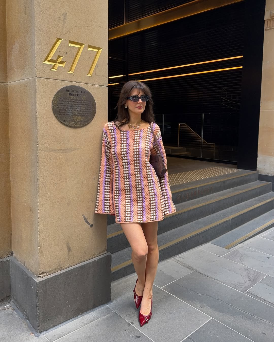 This crochet mini brings a fun dose of retro charm to a city sidewalk. The striped pattern in warm neutrals and dusty pink tones feels straight out of a vintage boutique, but the clean shape keeps it feeling modern.