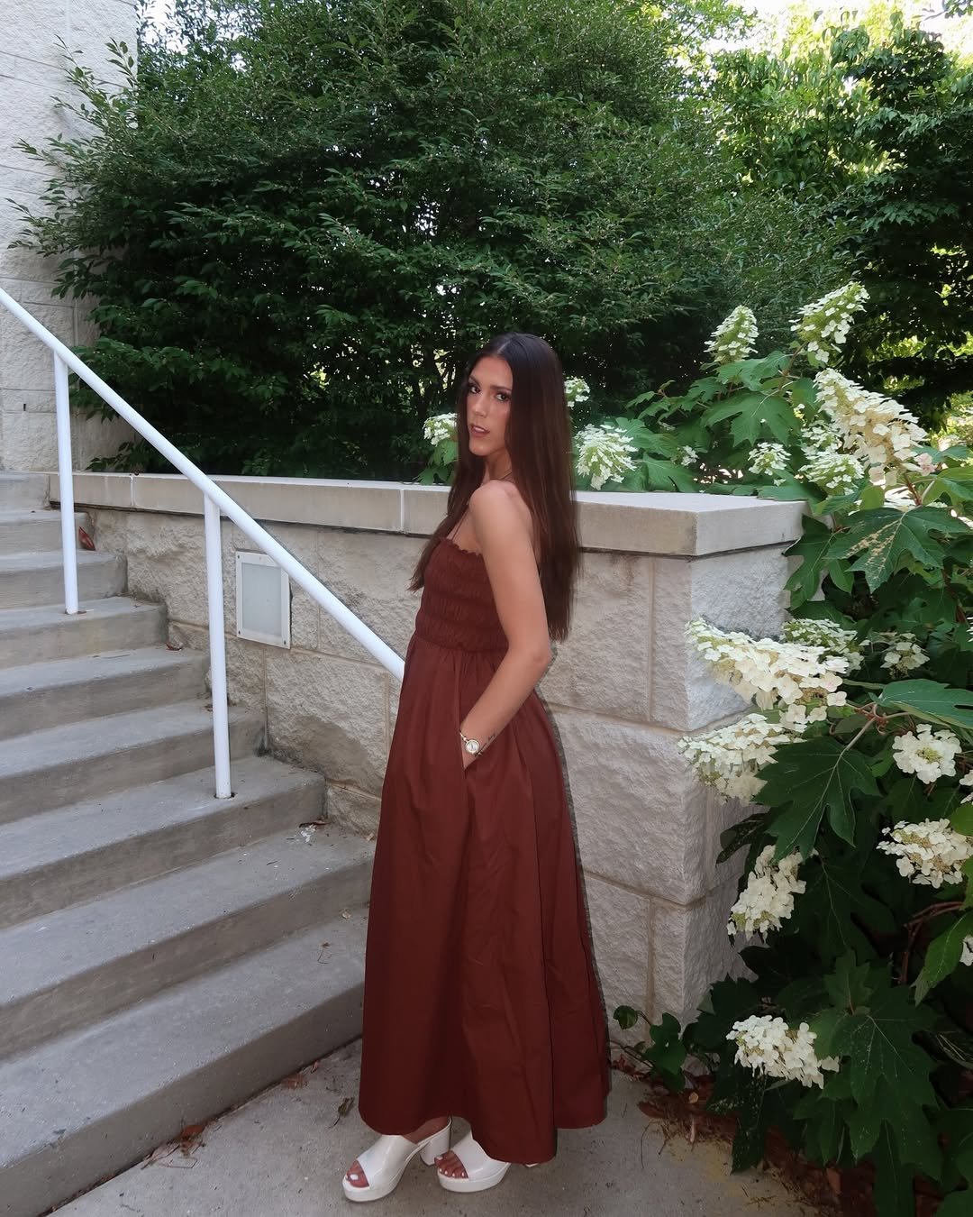 This deep terracotta maxi has such a grounded, earthy charm. The smocked bodice gives it shape while the long skirt keeps the look relaxed and easygoing.