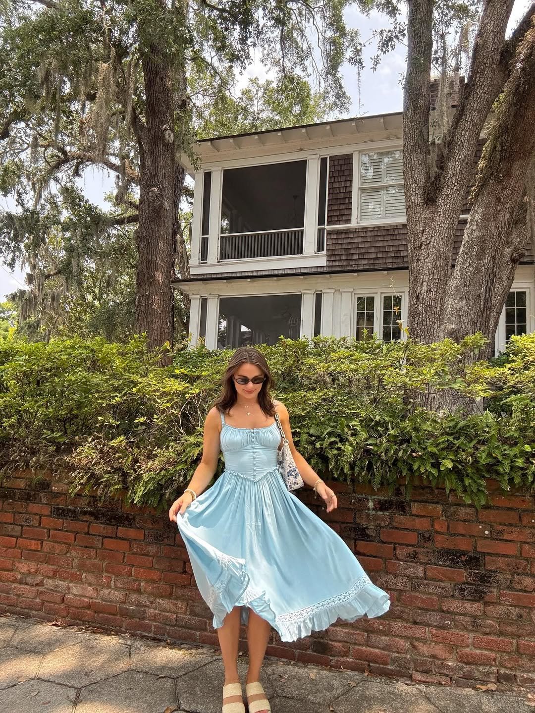 It’s the kind of dress that makes you want to twirl a little when you walk. Pair it with delicate heels or ballet flats, and suddenly any garden path feels like your own little fairytale scene.