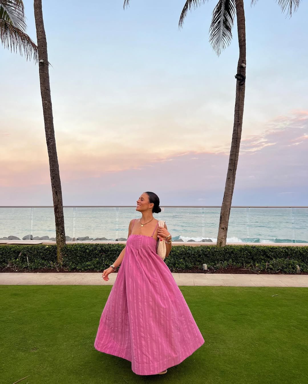 What makes this look shine is the simplicity. Bare shoulders, delicate jewelry, and a woven bag keep it grounded. It feels like the kind of dress you pack for vacation knowing it will make every evening photo look magical.