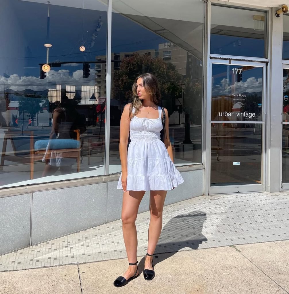 @jackiemadsen_ steps out in the kind of white summer dress that makes you want to twirl down a breezy city street. With its tiered skirt, fitted bodice, and spaghetti straps, this look is equal parts effortless and flirtatious.