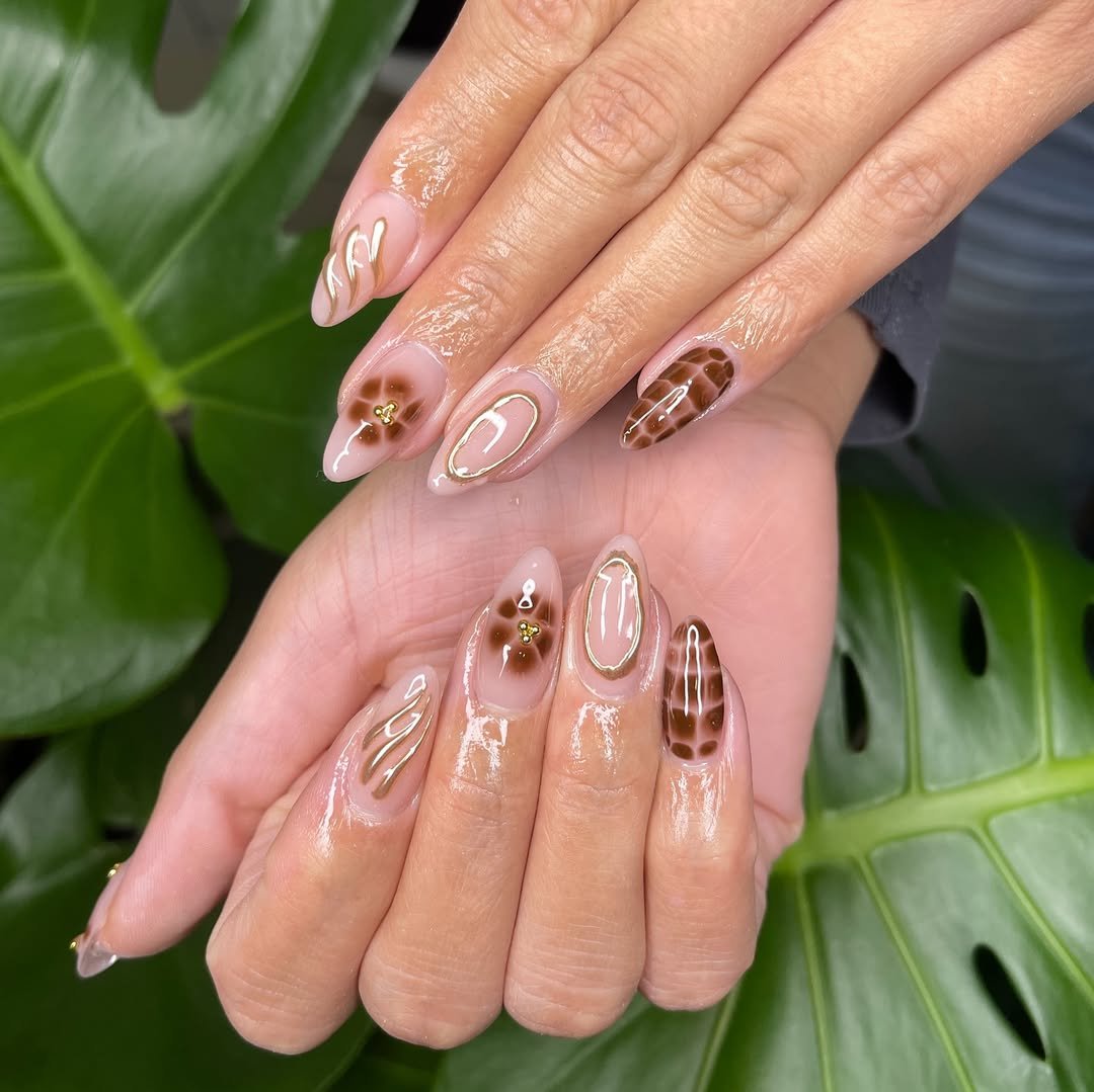 Each nail has its own unique identity — some glazed, some detailed, all beautifully cohesive. The golden accents elevate the warm neutrals, transforming what could’ve been “everyday brown” into something irresistibly luxe.