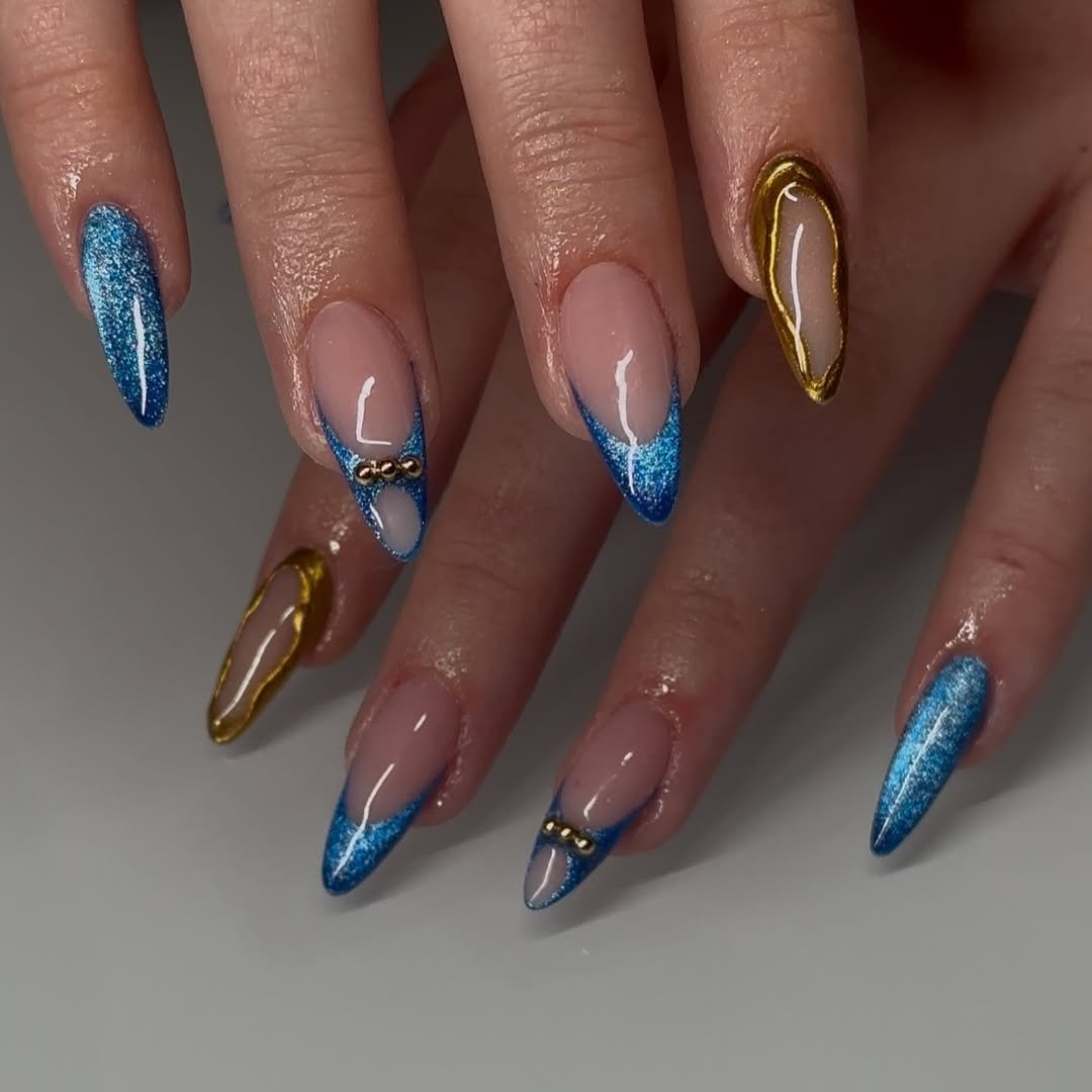 These nails are like a perfect mix of bold and luxurious. The electric blue shimmer paired with gold chrome accents makes for an ultra-modern combo that feels ready for the runway. There’s something about that vibrant hue against the soft nude base that just pops — it’s the kind of manicure that catches the light (and everyone’s attention) in the best way possible.