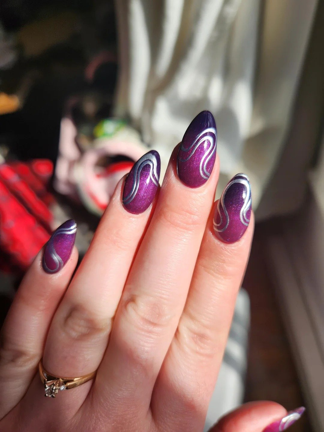 Deep plum chrome has never looked this luxurious. These almond nails shimmer like molten metal, with fluid, wavy edges that move like liquid light. The contrast of the rich purple against the nude base gives it that editorial edge — bold, but completely wearable.