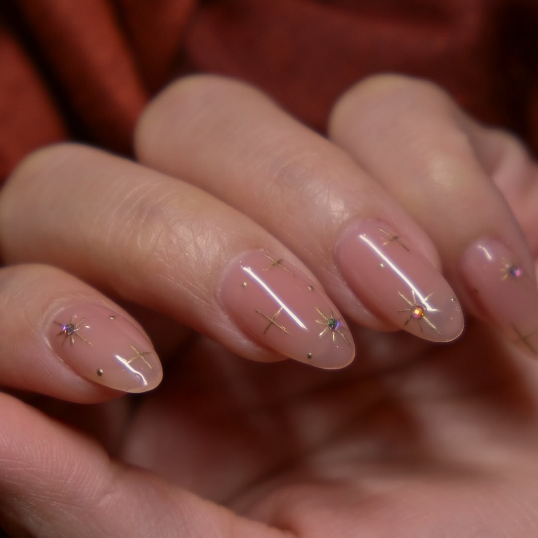 This soft nude base sprinkled with micro stars and twinkling dots is pure minimalist magic. The tiny golden bursts mimic starlight on skin, catching just enough glow without crossing into overdone territory. It’s celestial minimalism at its finest.