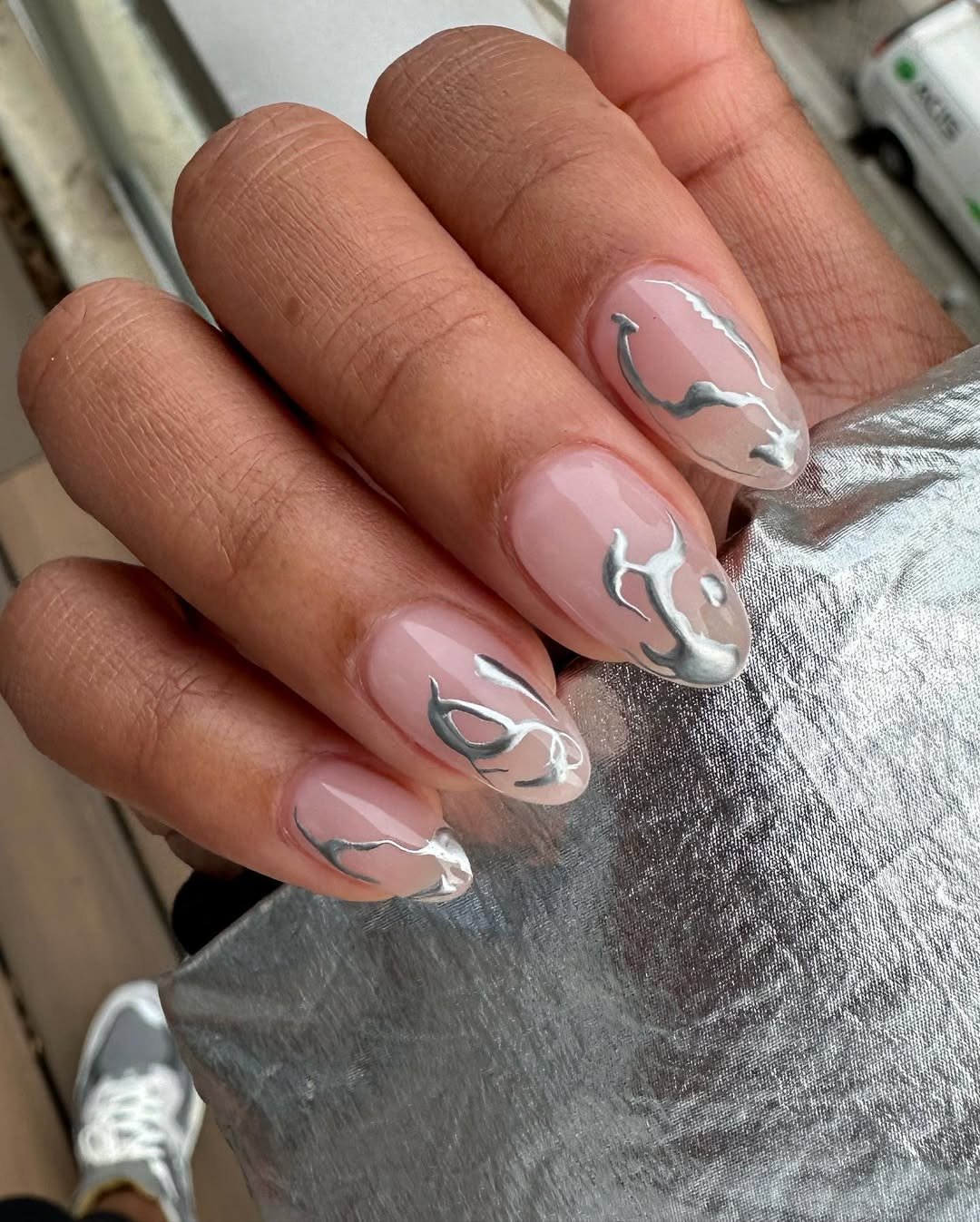 This mani makes silver chrome feel edgy, sculptural, and surprisingly wearable. Abstract flame-like streaks dance across a neutral base, catching the light in just the right way. There’s movement and intensity, but thanks to the soft almond shape, it never feels harsh.