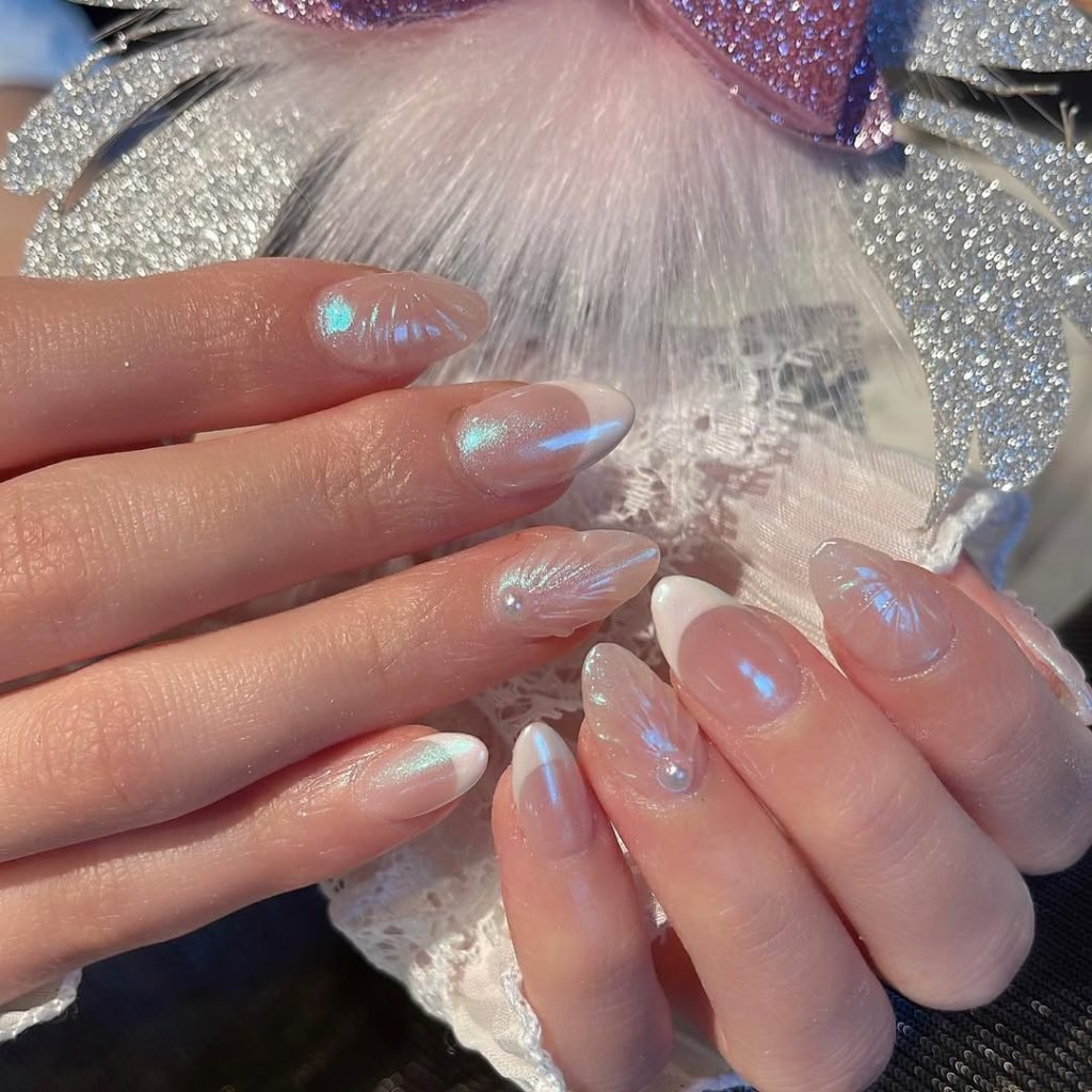 These nails are soft, dreamy perfection — a whisper of iridescent chrome with delicate pearlescent shimmer. The details are stunning: tiny 3D embellishments, subtle white tips, and that angelic glow that makes your hands look like they belong in a fairy tale.