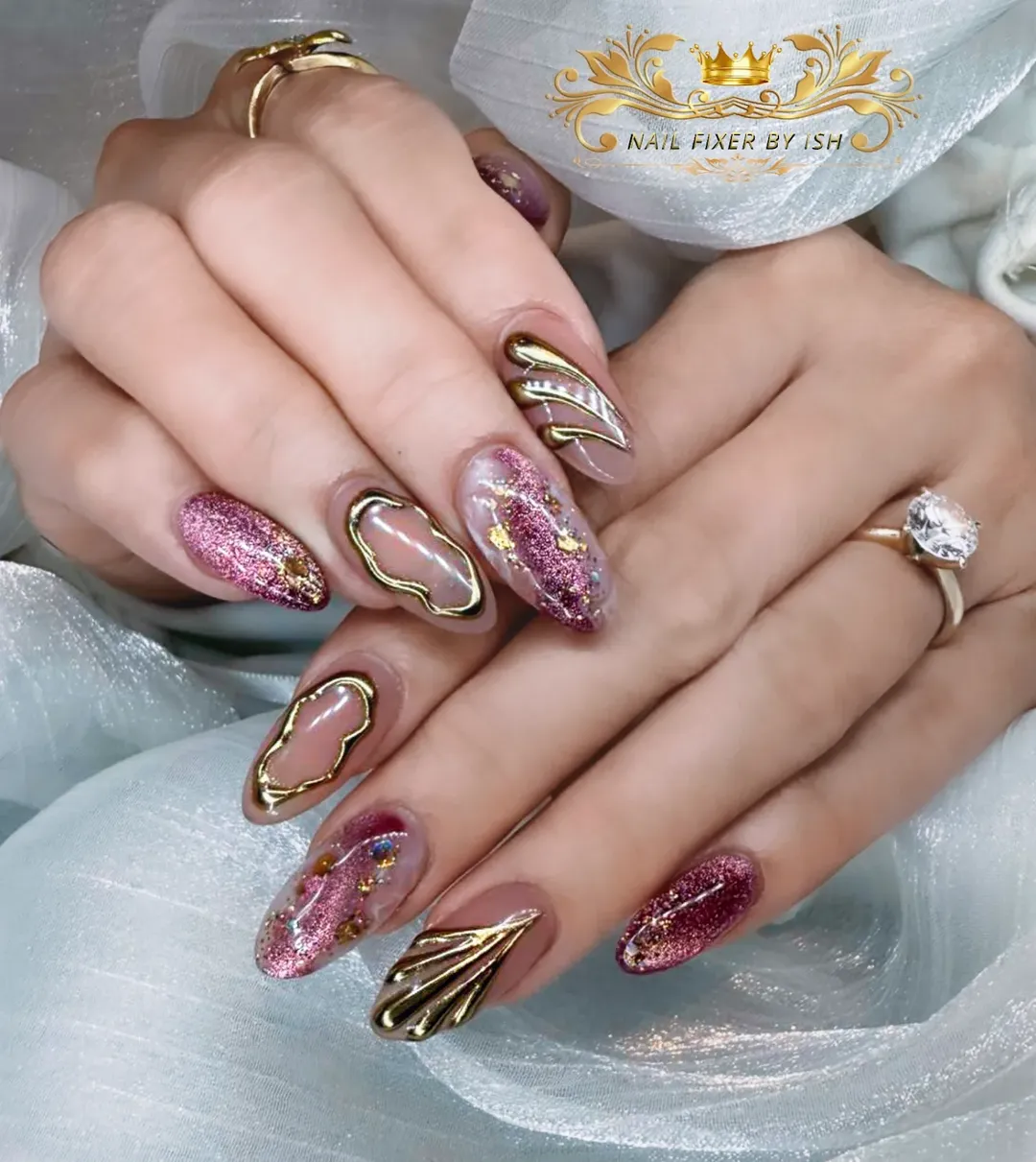 If “romantic opulence” had a nail form, it would be this. The pink chrome base glimmers like crushed rose quartz, while gold detailing swirls and frames each nail like molten jewelry. There’s texture, there’s sparkle, there’s artistry — it’s a full visual experience.