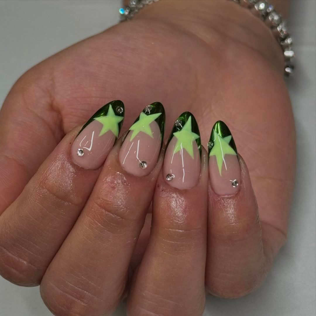Bold? Yes. Playful? Absolutely. But somehow still chic, thanks to the chrome green accents and soft almond shaping. These nails pair a high-shine black-green metallic with lemon-lime stars that feel Y2K-meets-editorial in the best way.