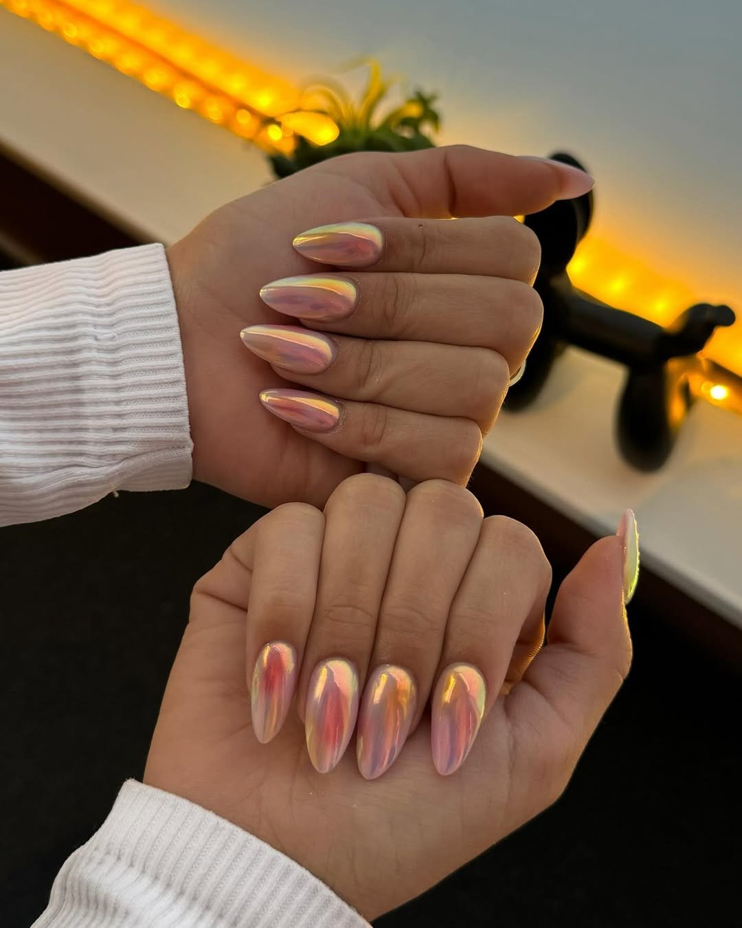 Warm and iridescent, this golden-pink chrome mani captures that perfect sunset reflection you only get for a few fleeting minutes. The colors shift between peach, rose, and gold depending on the light, giving the nails an ethereal glow that feels both dreamy and fresh.
