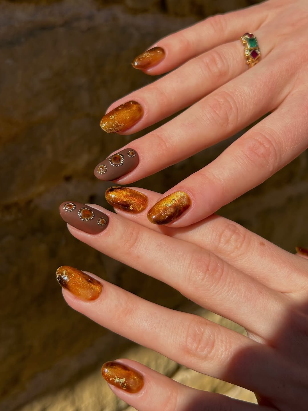 But the real standout? That matte cocoa accent nail adorned with earthy gemstone decals and delicate metallic dots. It’s giving vintage opulence in the most lowkey, curated way. There’s something about the combo of shine and soft matte that keeps the whole look grounded and chic — no flashiness, just quiet richness.