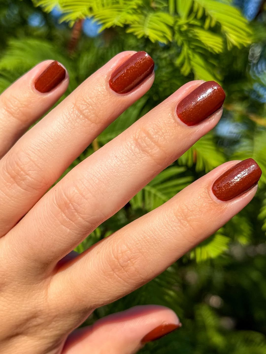 @kayjmanis takes a simpler route with this one, proving that minimal doesn’t have to mean boring. The deep cinnamon-brown polish, kissed with subtle shimmer, glows beautifully under sunlight — like the perfect bronzed cup of coffee. It’s warm, grounding, and stunningly understated.