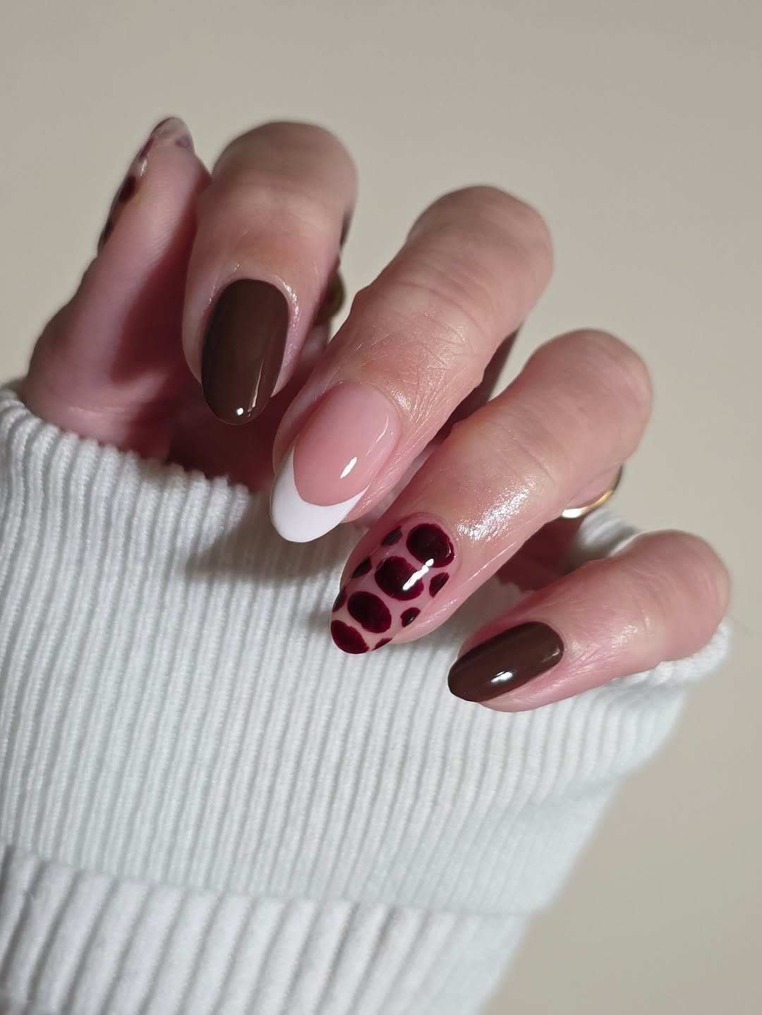 This design by @rilizzles_nails is where playful meets polished. Deep chocolate tones pair beautifully with a soft blush base and a crisp white French tip — a trio that feels both classic and unexpected. But the real moment? That maroon leopard accent nail, which adds the perfect hint of edge without overpowering the look.