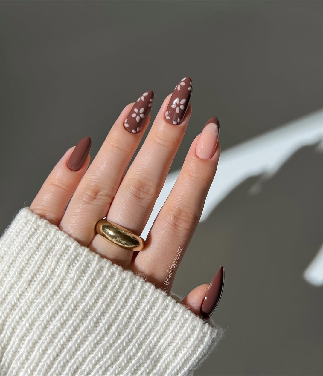 This set by @nailsbypaular is pure cozy-girl charm. The mix of chocolate matte nails, mocha swirls, and dainty white daisies feels playful but refined — like a vintage floral print turned chic.