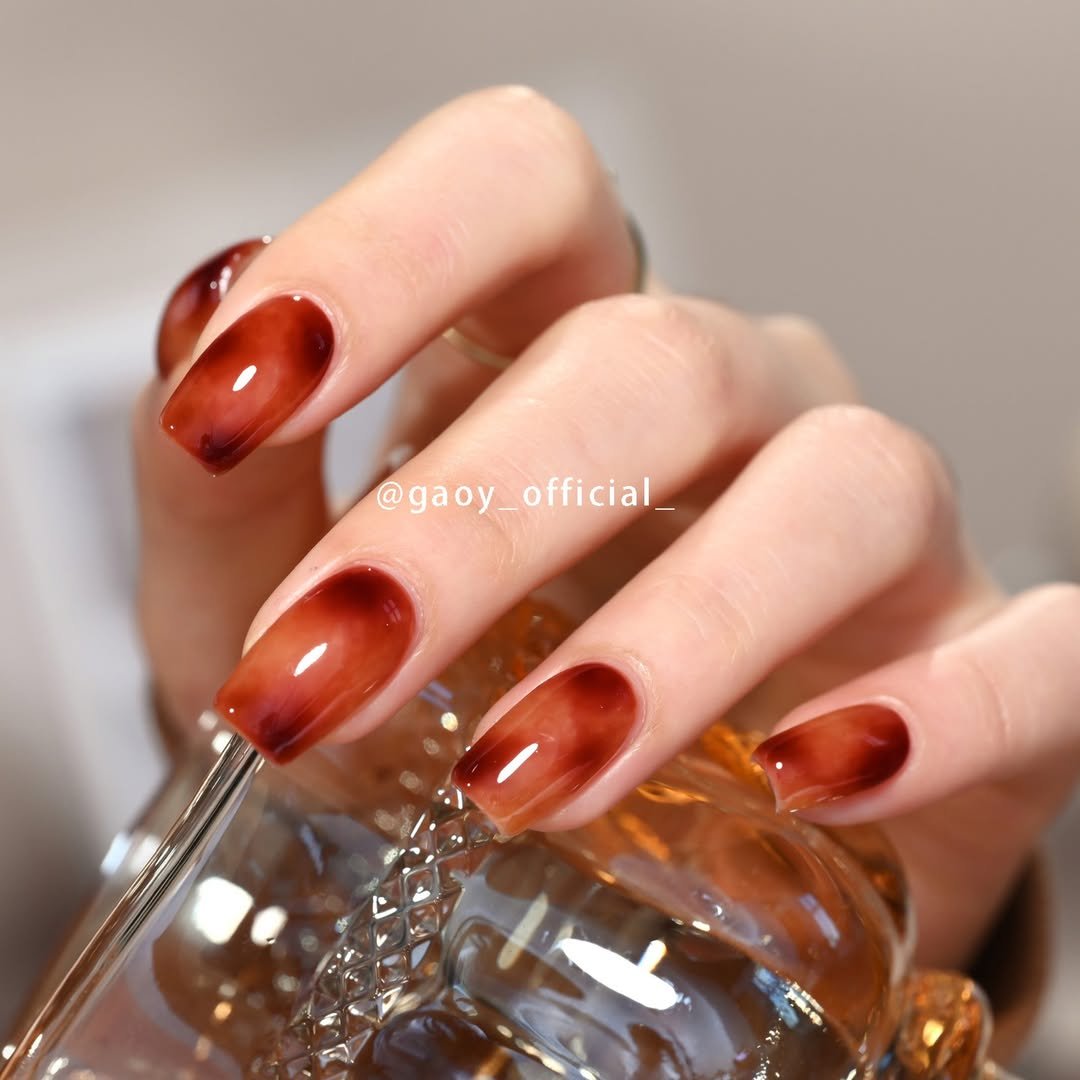 These rich cognac nails from @gaoy_official_ look like they were poured straight from a decanter. The glossy, slightly translucent finish gives them a syrupy effect, like melted sugar or stained glass in warm rust tones.