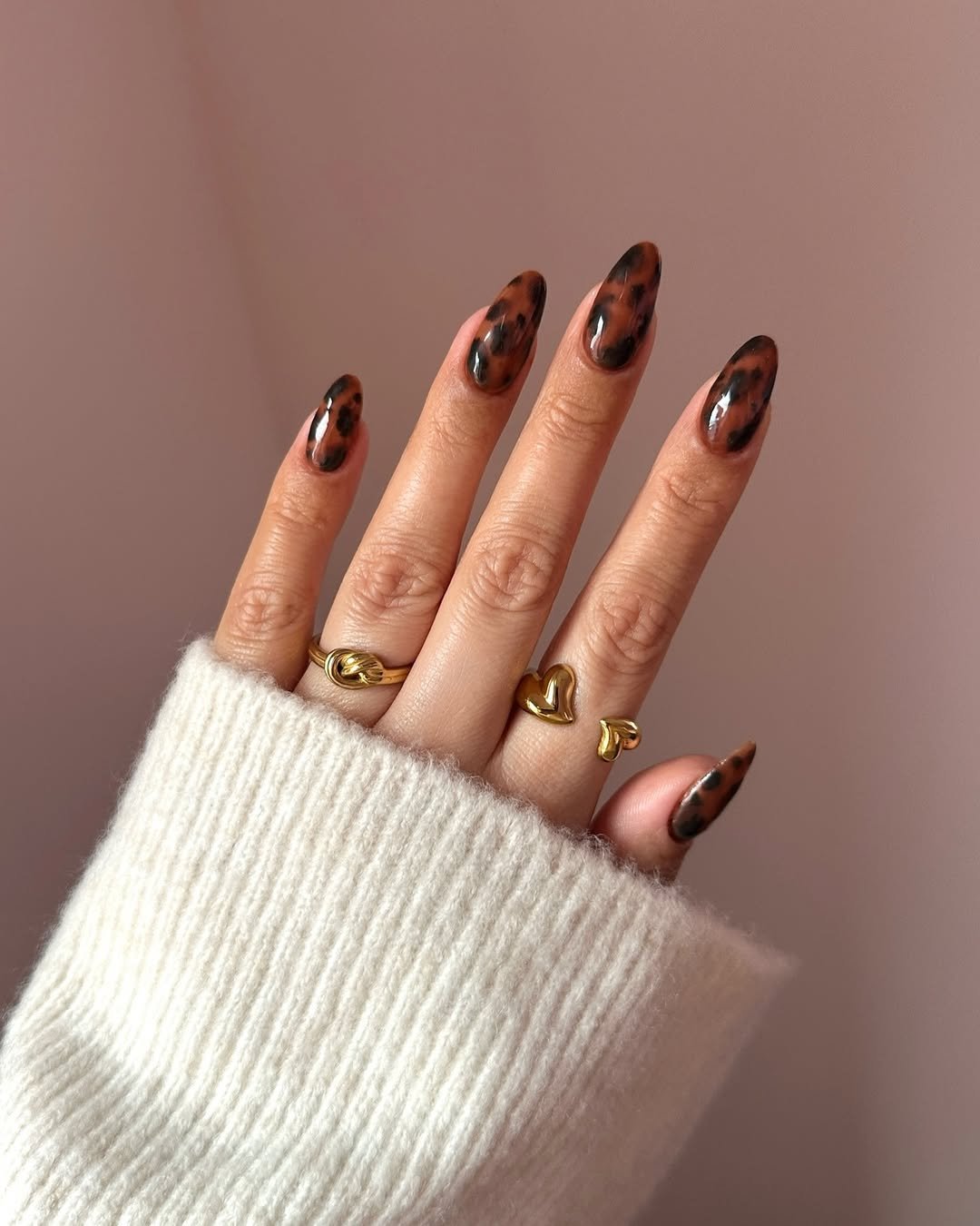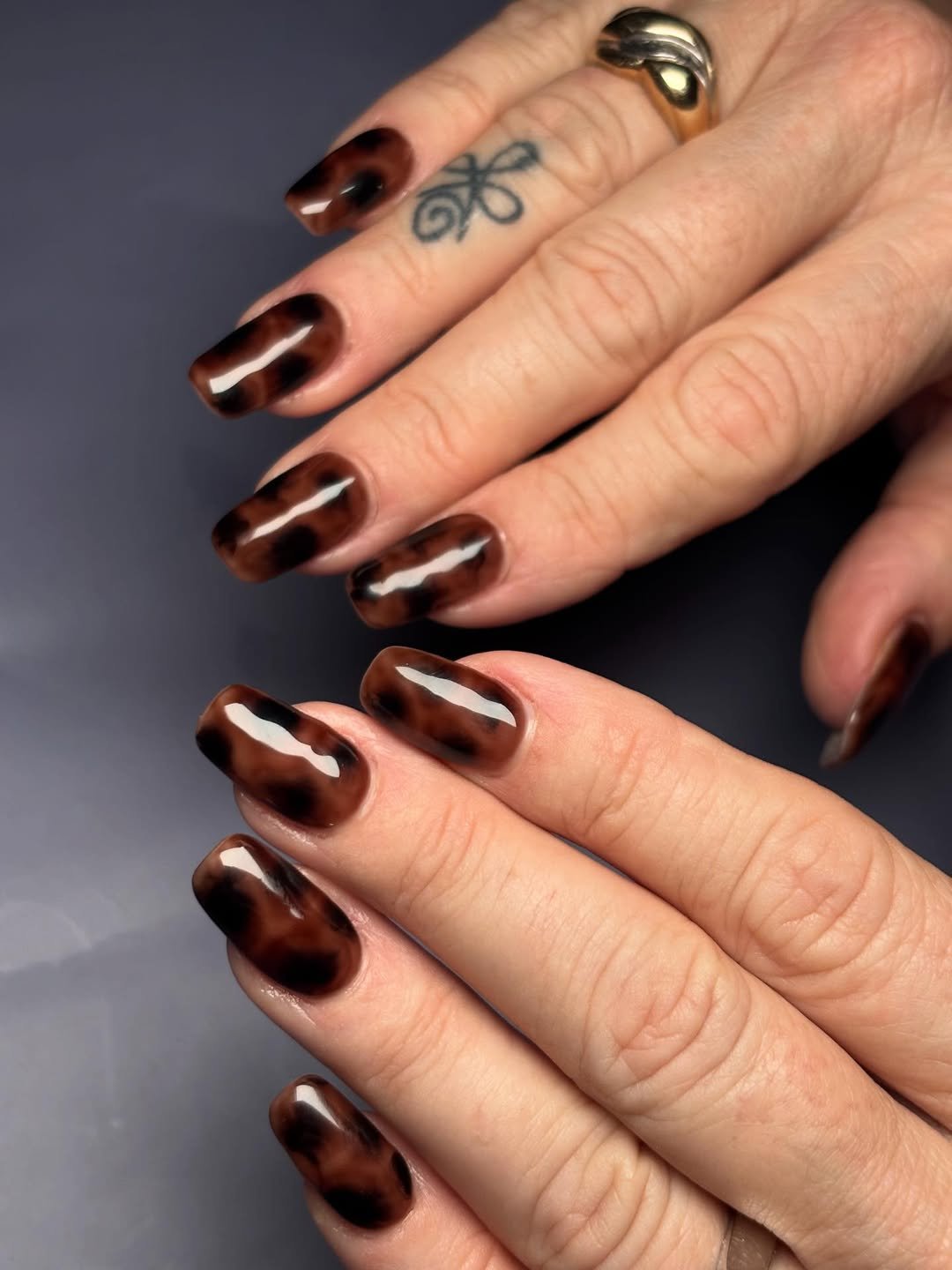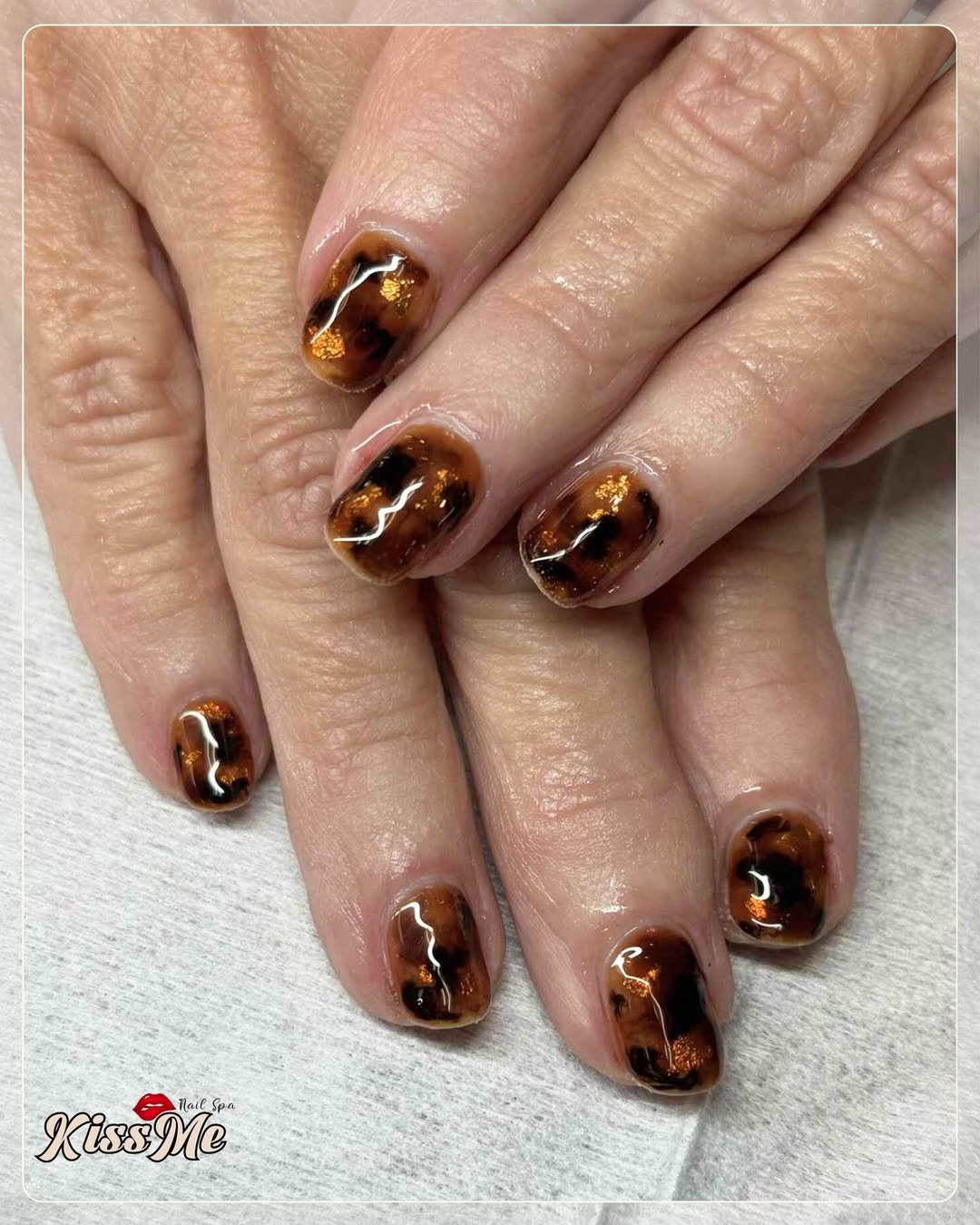 @kissmenailspa delivers a classic tortoiseshell finish that looks rich, dimensional, and timeless. The glossy brown and black layers blend like melted caramel over glass, creating that signature speckled pattern we all love.