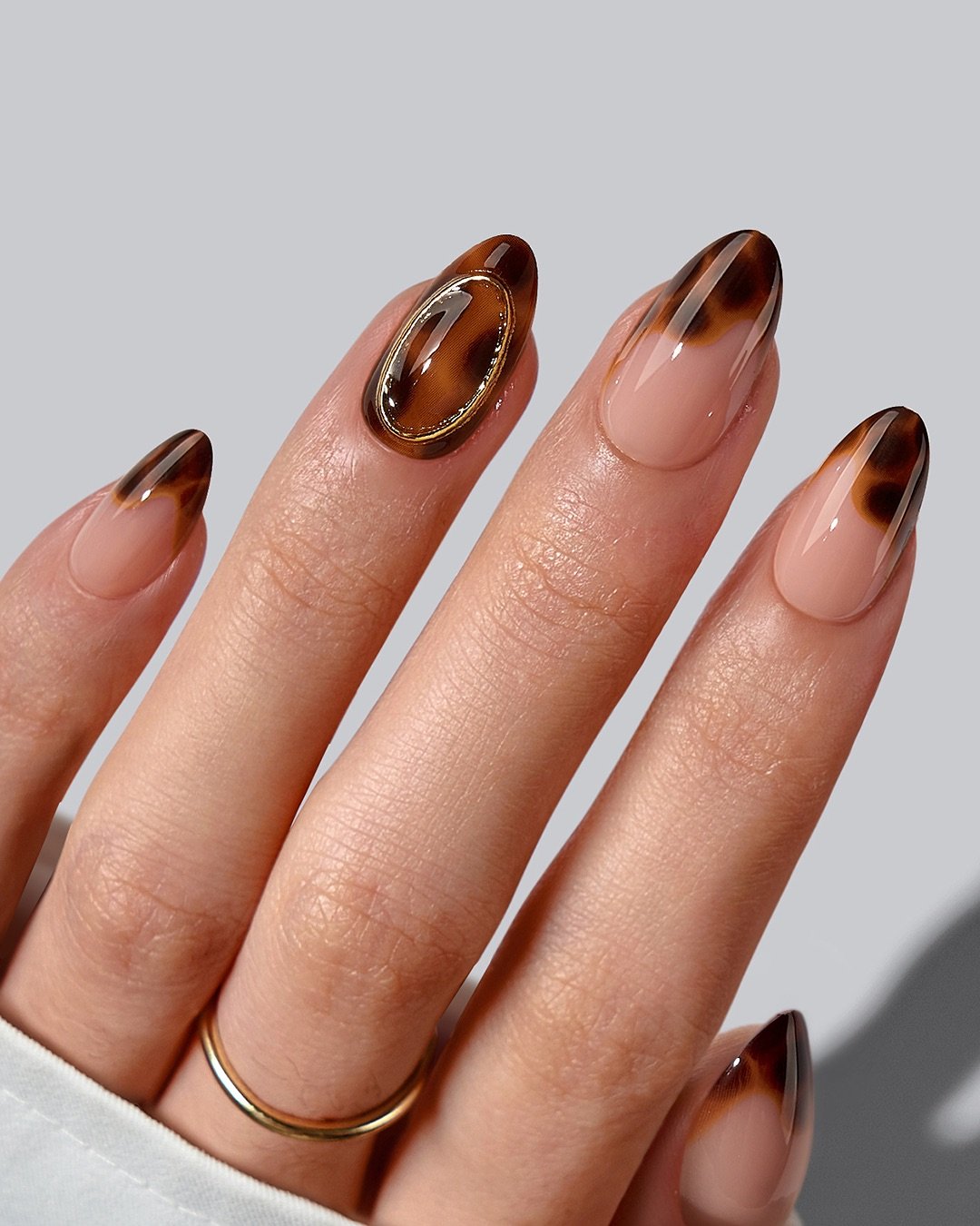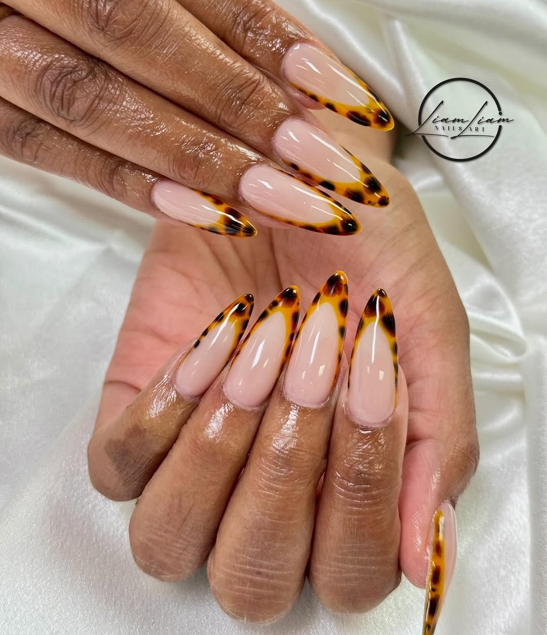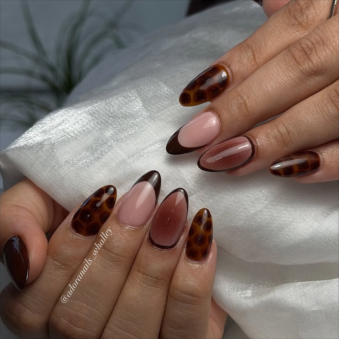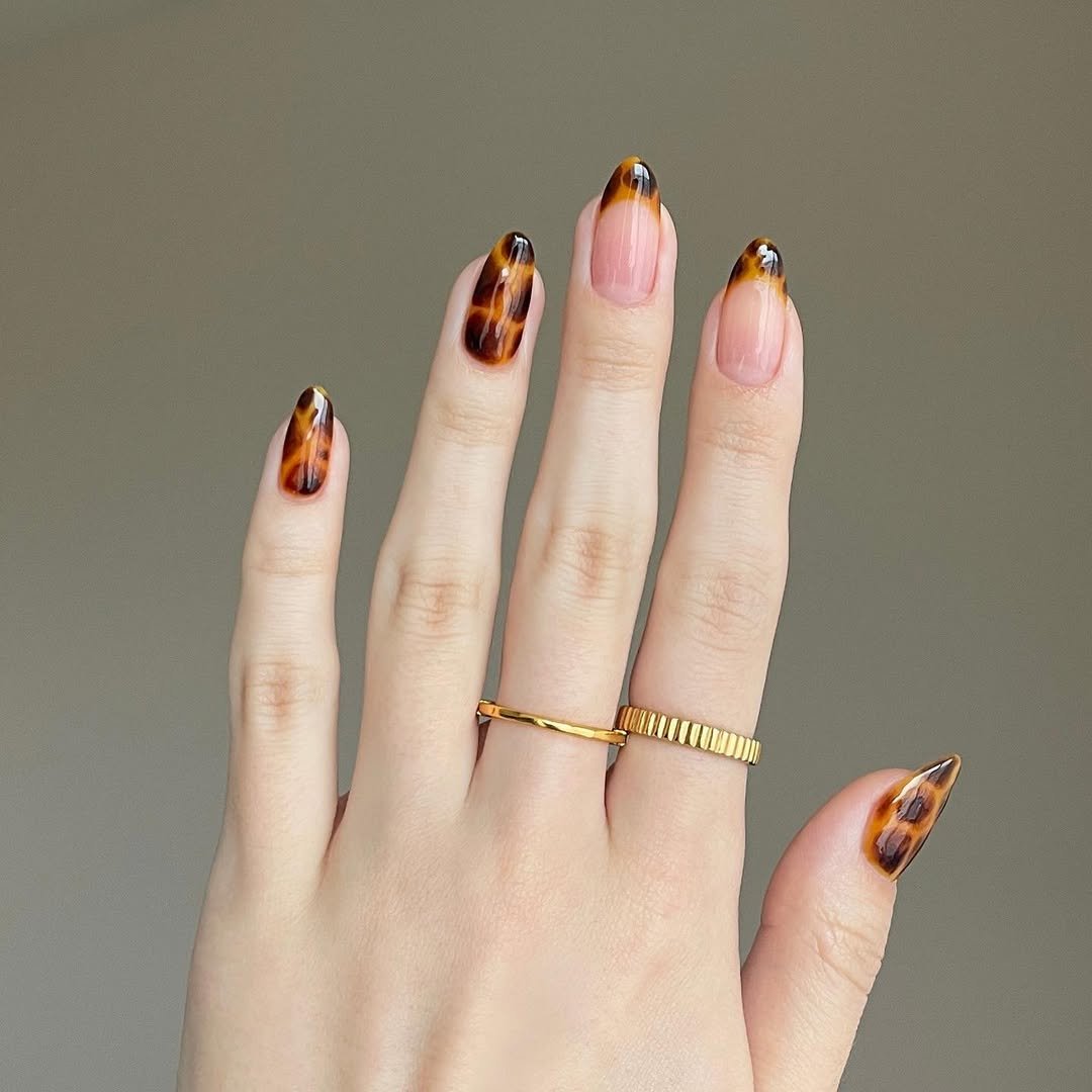 The classic French tip gets a sultry tortoiseshell twist with @liamtucsonnails. These long almond nails mix creamy nudes with smoky amber tips that fade beautifully, like tortoise sunglasses turned into nail art.
