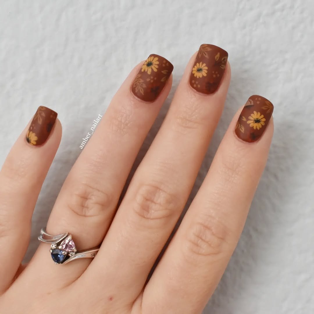 A little bit vintage, a little bit botanical — this daisy-studded brown set by @amber_nailart feels like something you’d wear while sipping chai on a rainy morning. The soft, matte finish gives it a velvety, almost suede-like texture, and the mustard-yellow blooms are just the right touch of sweet.