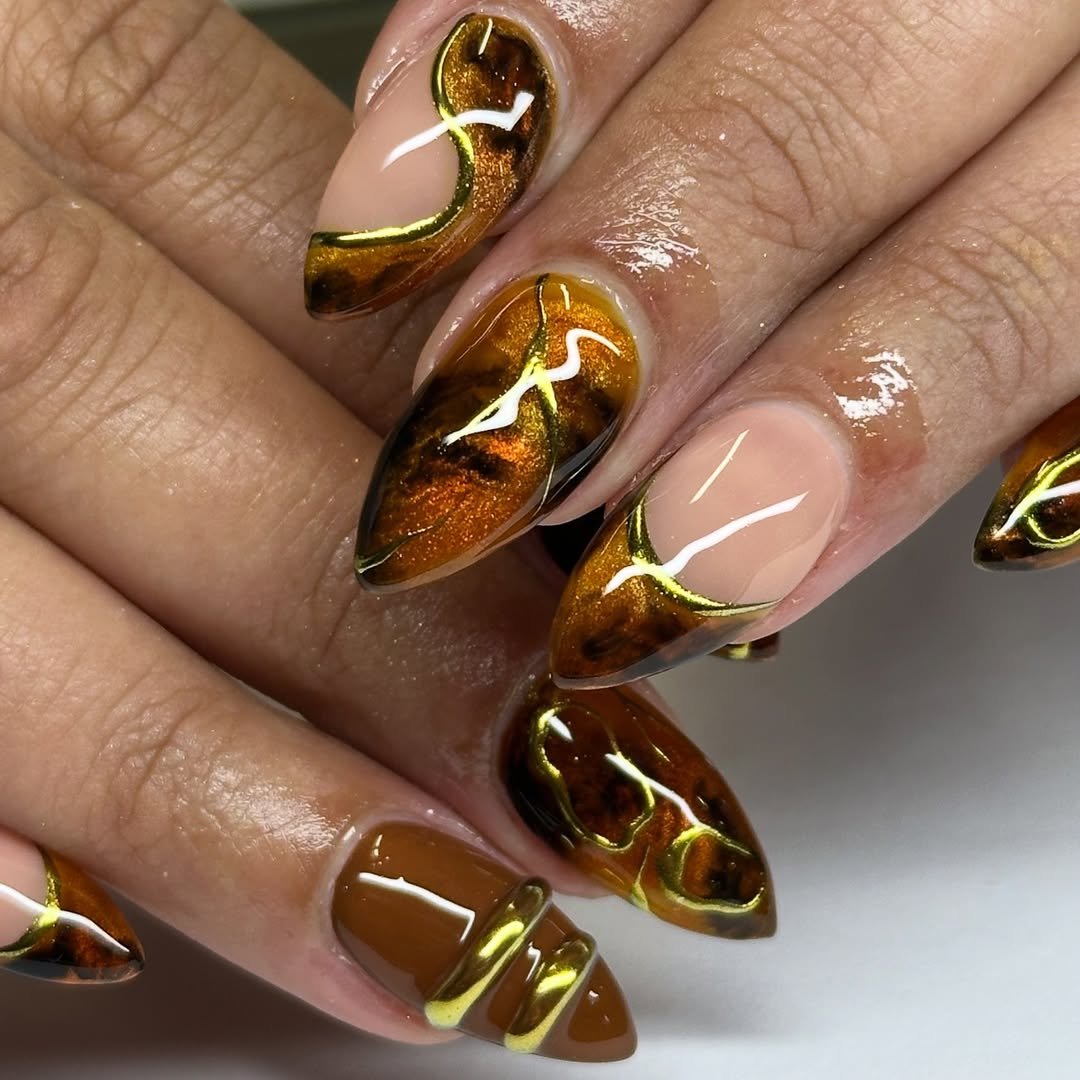 If nails could capture sunlight, they’d look like this. @veedidem brings movement and shine with these amber-brown tips lined in molten gold. Each nail flows with organic, marbled swirls that look straight out of an art gallery.