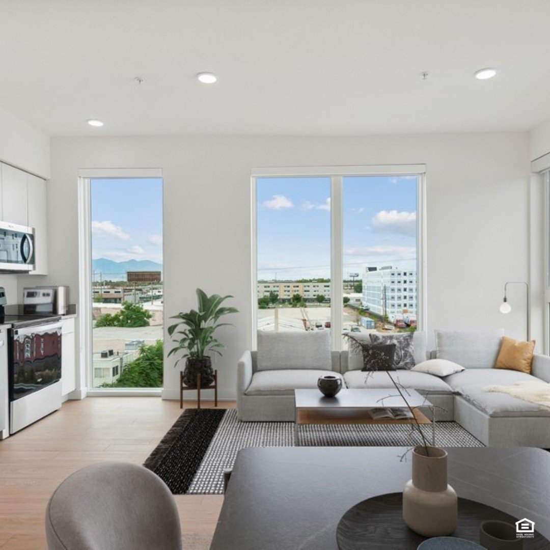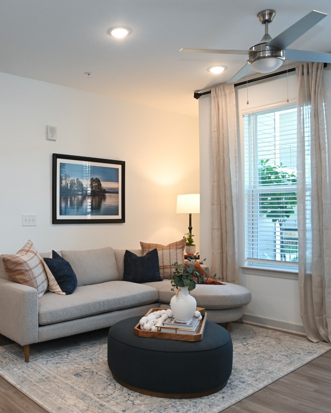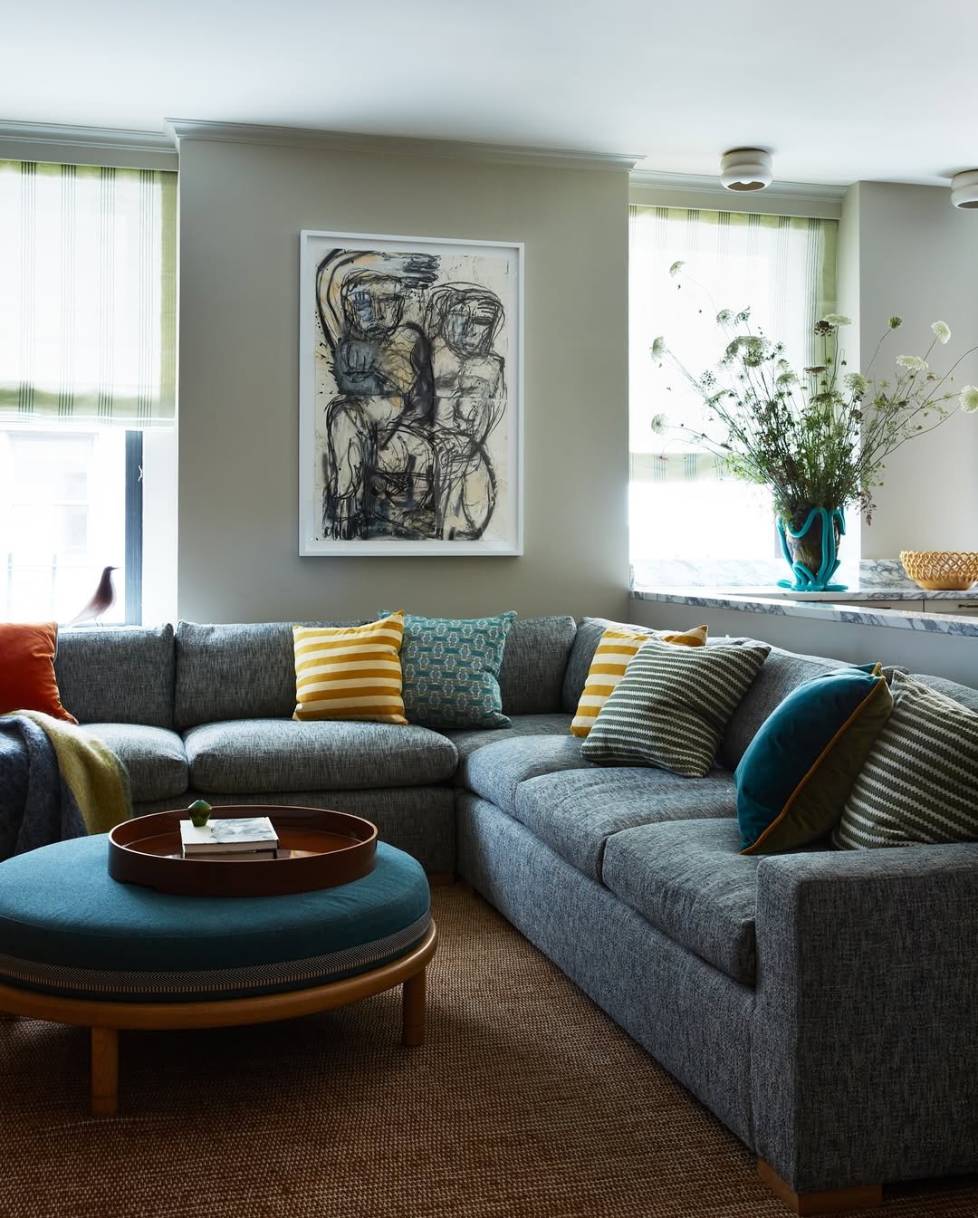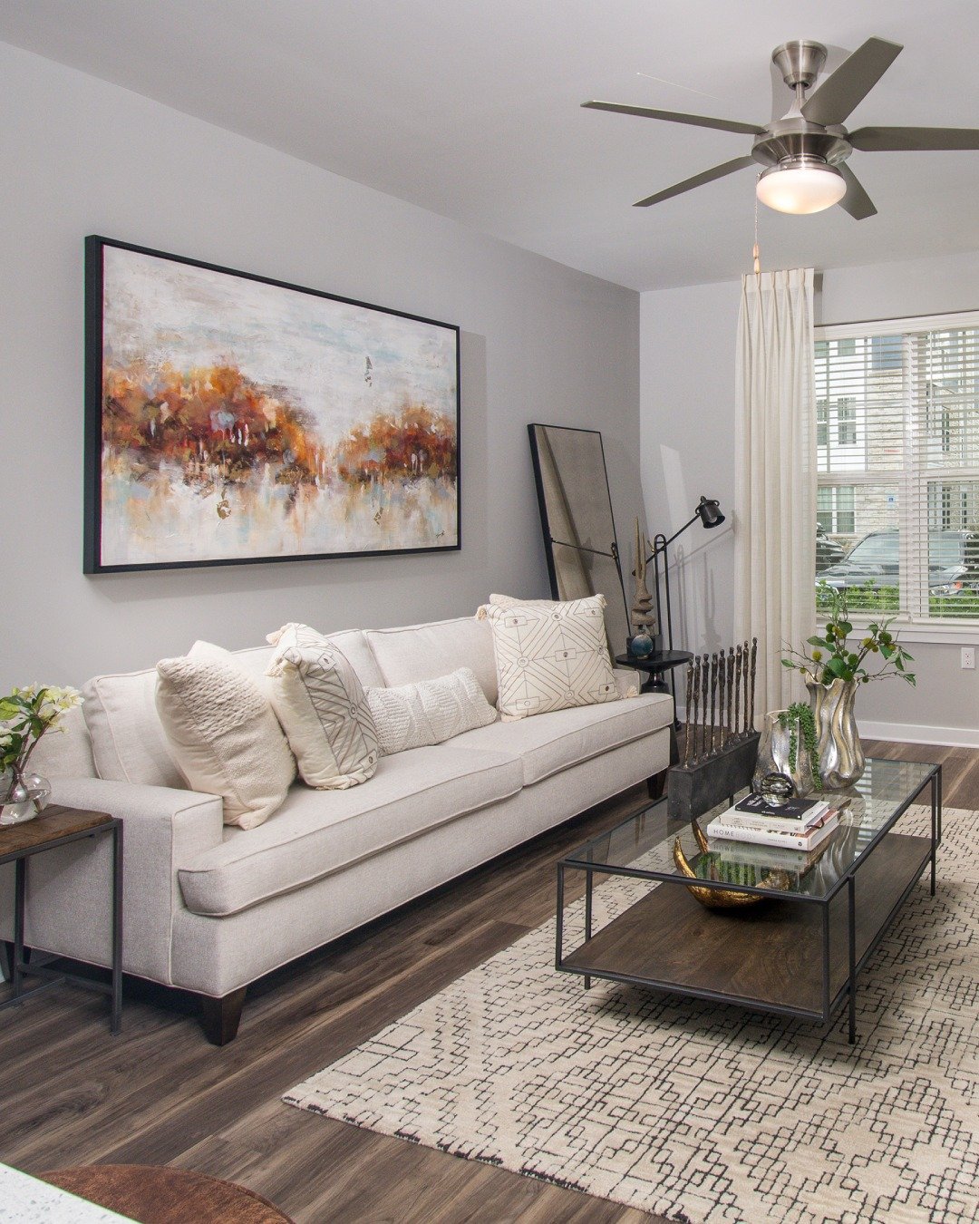 This space feels like a deep breath. Big windows, clean lines, and that soft grey sectional create a layout that’s open without feeling empty.