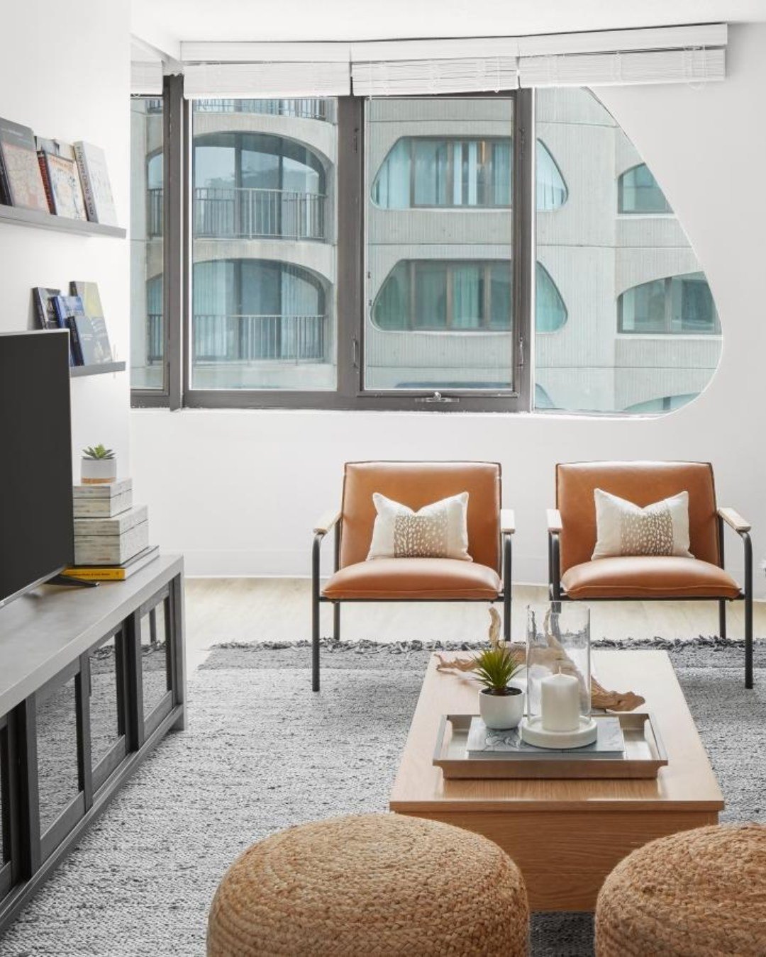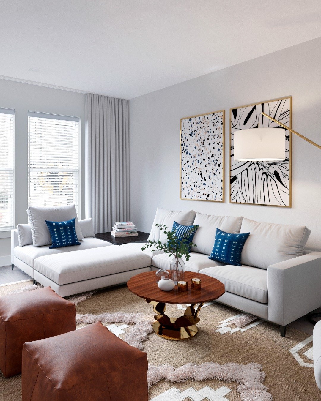 There’s a crispness here that just hits right. The white sectional sets the tone, but those blue pillows and warm leather poufs bring in just enough contrast to keep it from feeling flat.