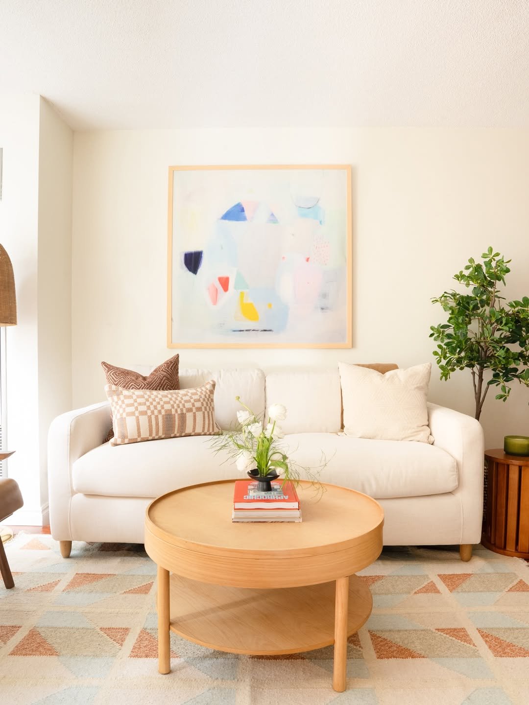 This one feels like sunshine bottled into a room. The creamy sofa, playful cushions, and that round wood coffee table keep things relaxed but still intentional.