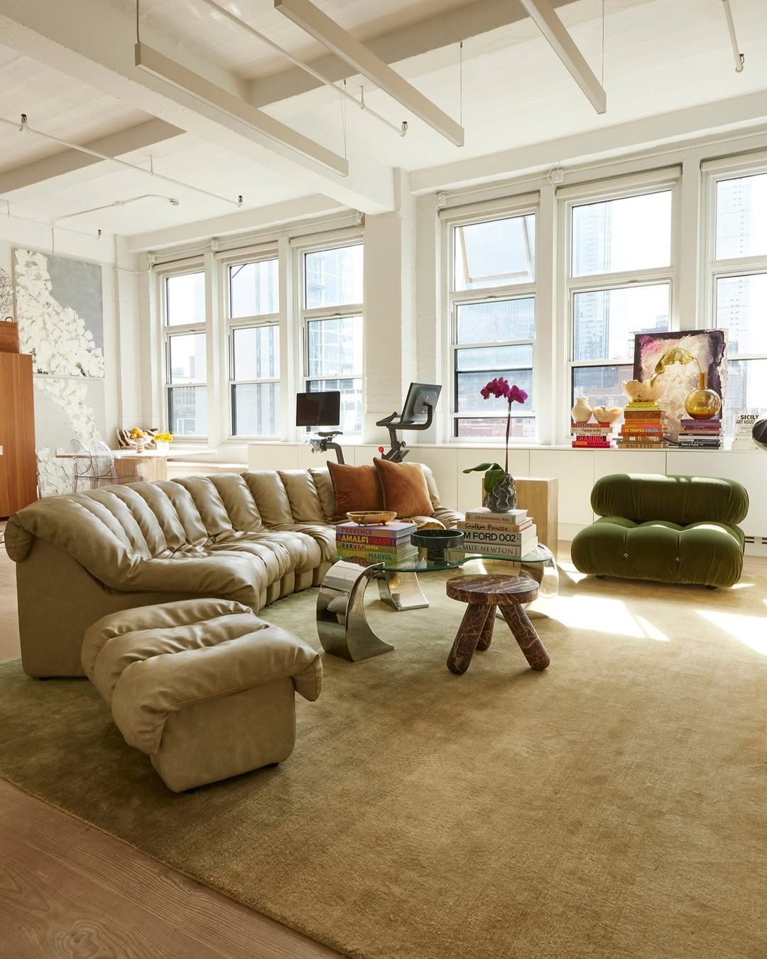 High ceilings, big windows, and all that open space—but somehow it still feels grounded. That low, plush sectional anchors the room perfectly against all the architectural drama.