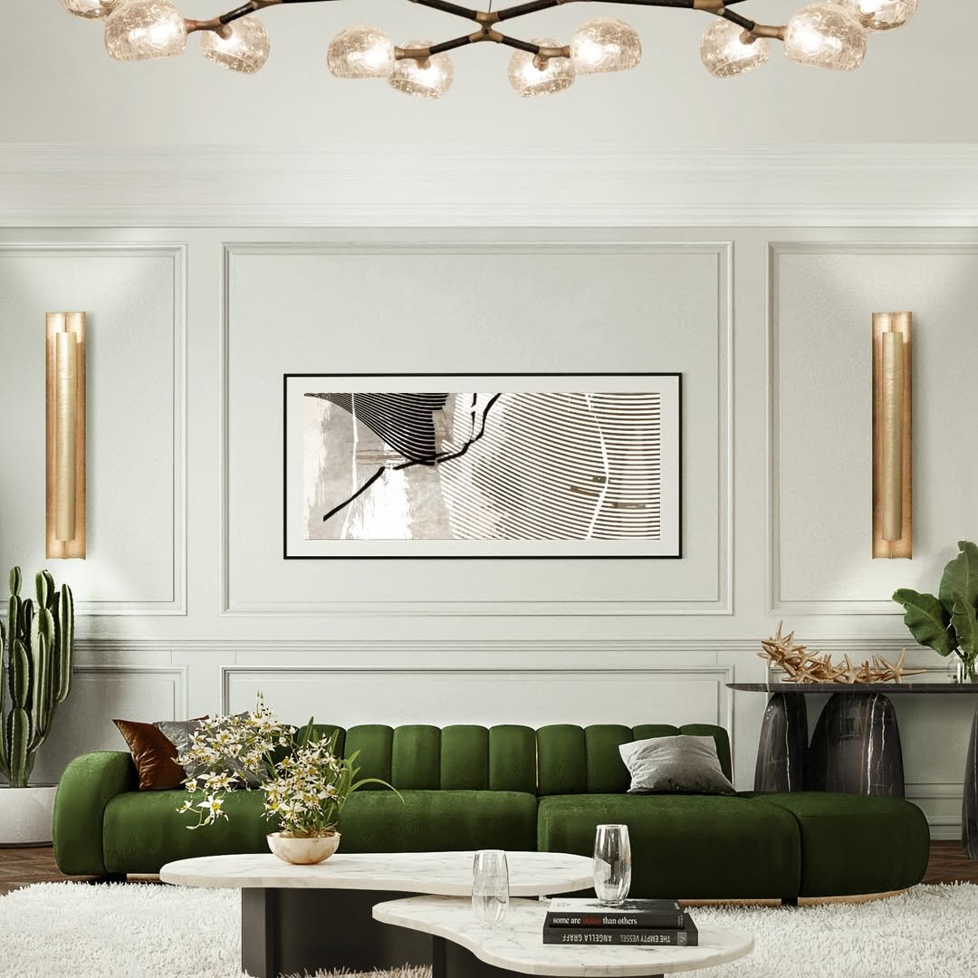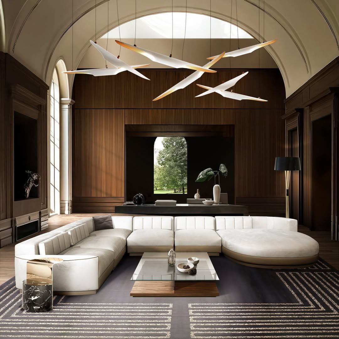 This room doesn’t whisper—it glides. The curved sectional, soaring ceilings, and those bird-like pendant lights make it feel almost gallery-like.