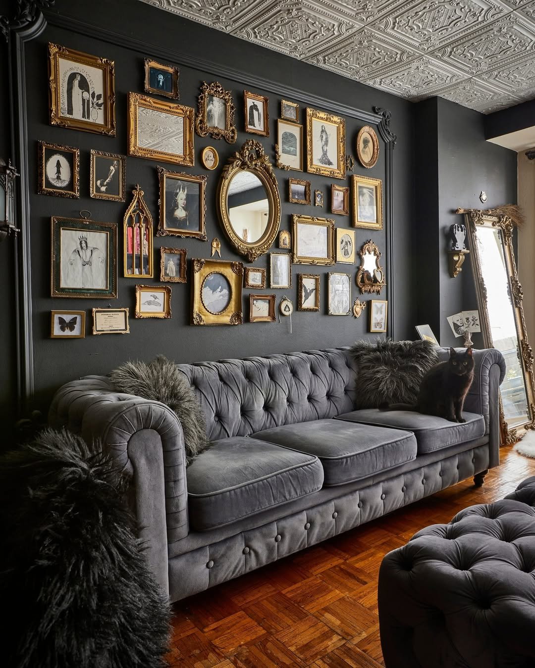 This is where things get a little dramatic—in the best way. Deep walls, ornate frames, and that velvet sofa create a whole mood that feels rich and curated.