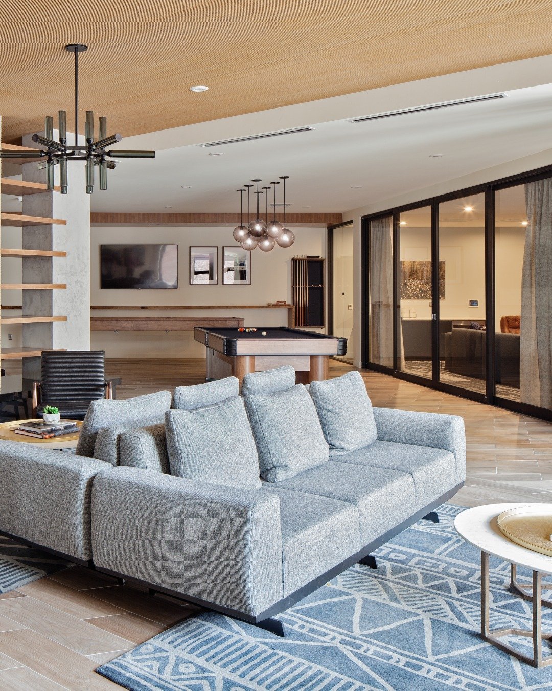This isn’t just a living room—it’s a whole vibe. Between the pool table, layered lighting, and that structured grey seating, it feels like a space designed for people to actually gather.