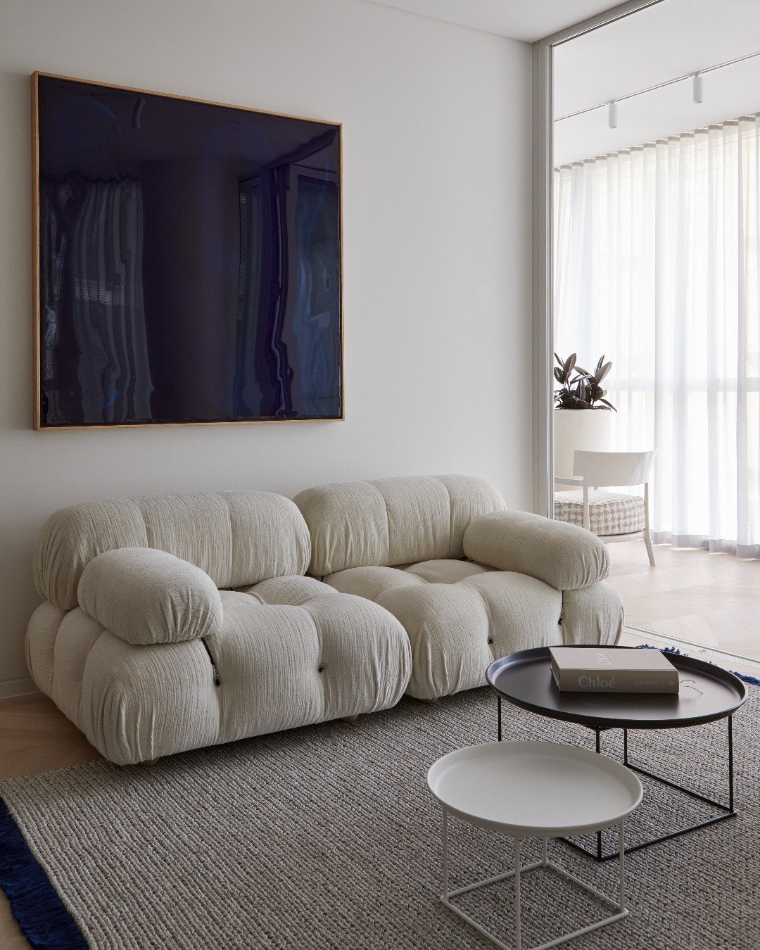 That sofa is all about shape. Rounded, plush, and almost sculptural—it instantly gives the room a high-design feel without needing much else.