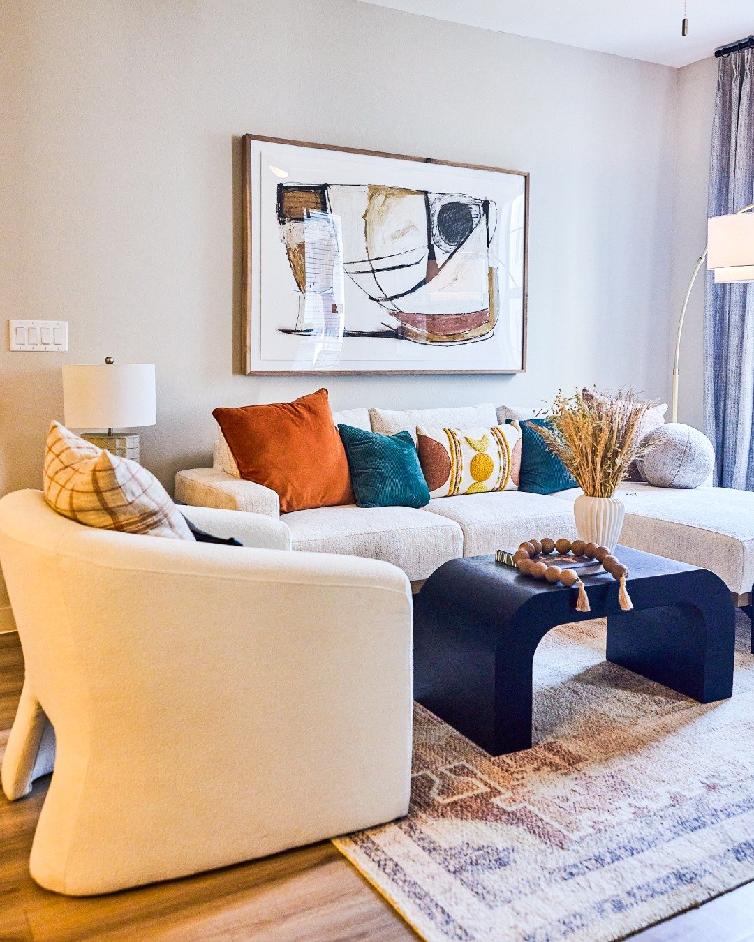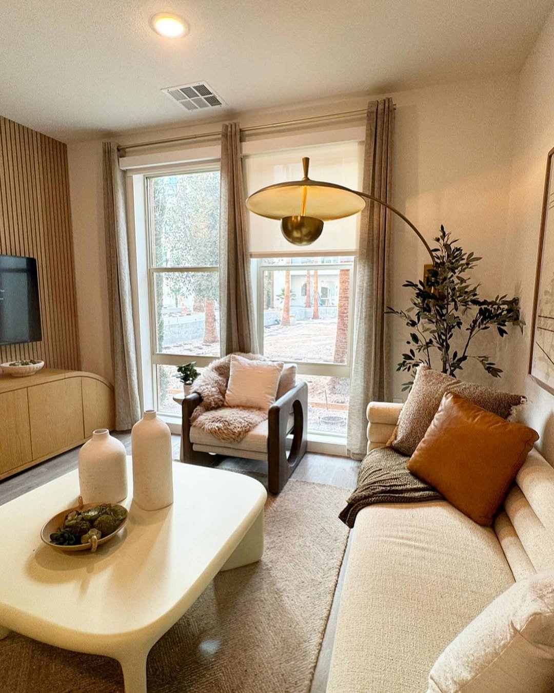 This is the kind of living room that instantly slows your heartbeat. The soft beige palette, layered textures, and that curved sectional just make everything feel easy and livable.