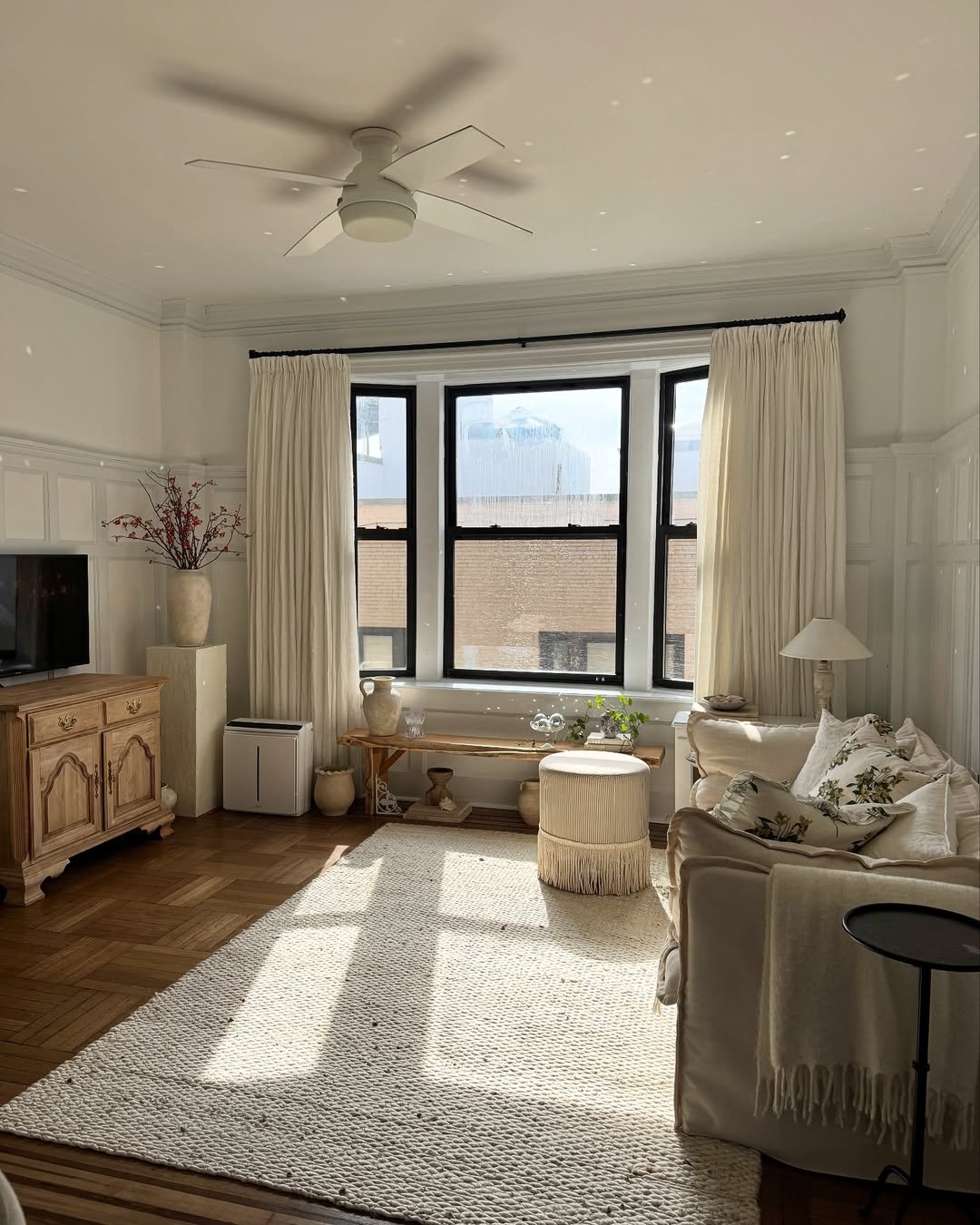There’s something about this room that feels like golden hour all day long. The creamy tones, layered textures, and soft curtains turn sunlight into part of the decor.