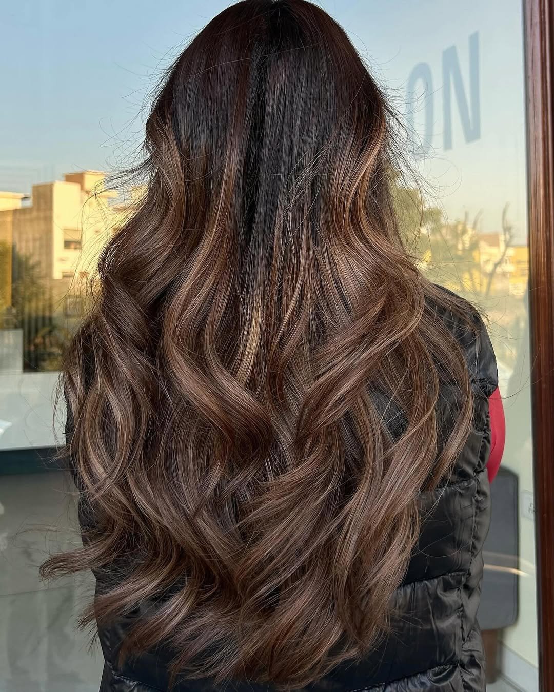It’s that shade that lives between brunette and bronde, perfect for someone who wants to stay dark but still have those sunlit pieces for balance. It gives major “elevated natural” energy — think cashmere sweaters, glossy lips, and an espresso in hand.
