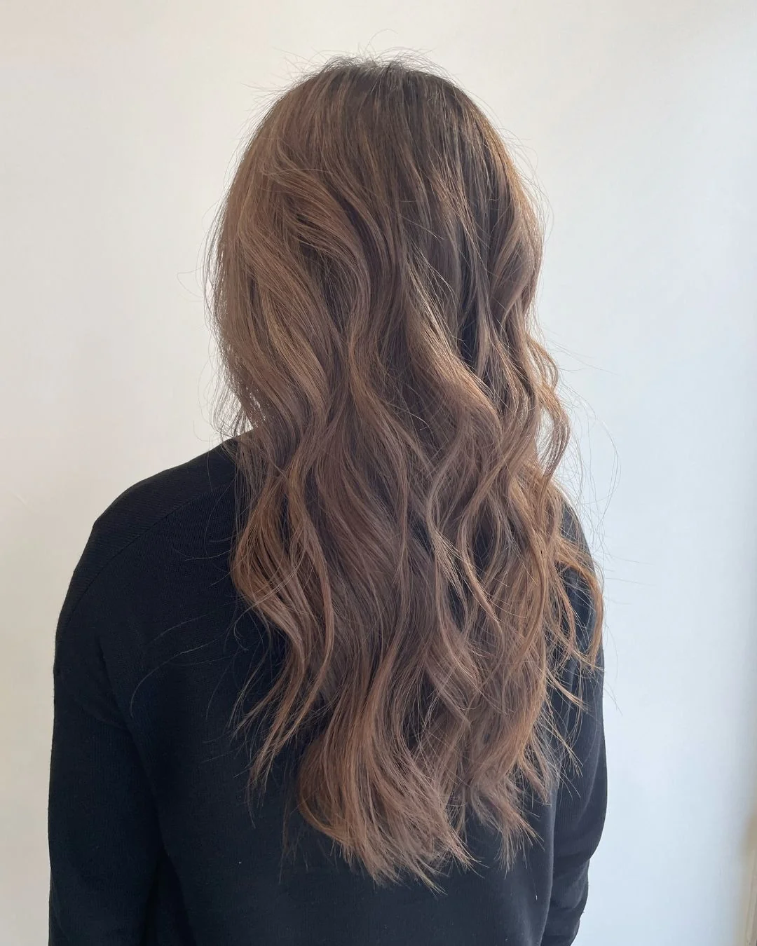 The @hairbyniss creation leans slightly into rose territory — a soft ash brown kissed with muted pink undertones that add warmth without losing that smoky vibe. It’s feminine, subtle, and oh-so-glowy under soft light.