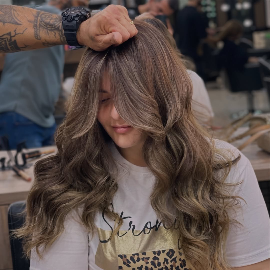 The @ronyfrancis.leb look is pure volume and glow — a dimensional ash brown that cascades into soft, luminous curls. The money-piece highlights around the face give it that subtle lift, brightening the overall tone without losing depth.